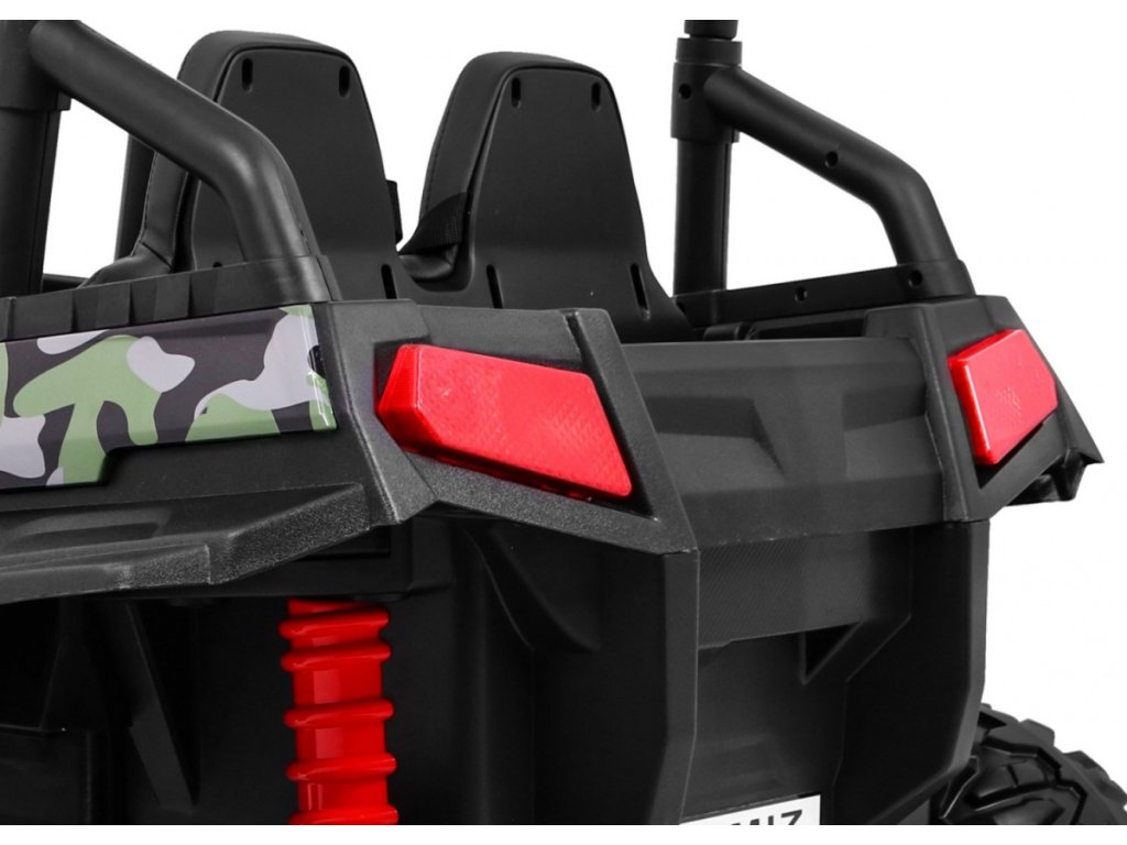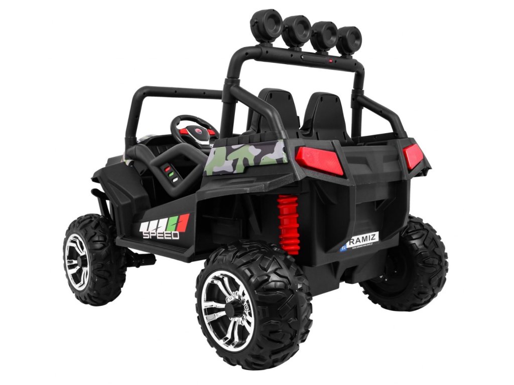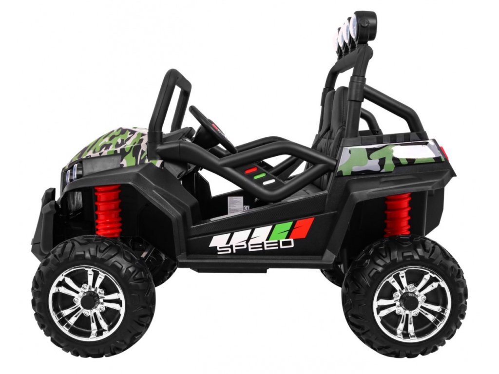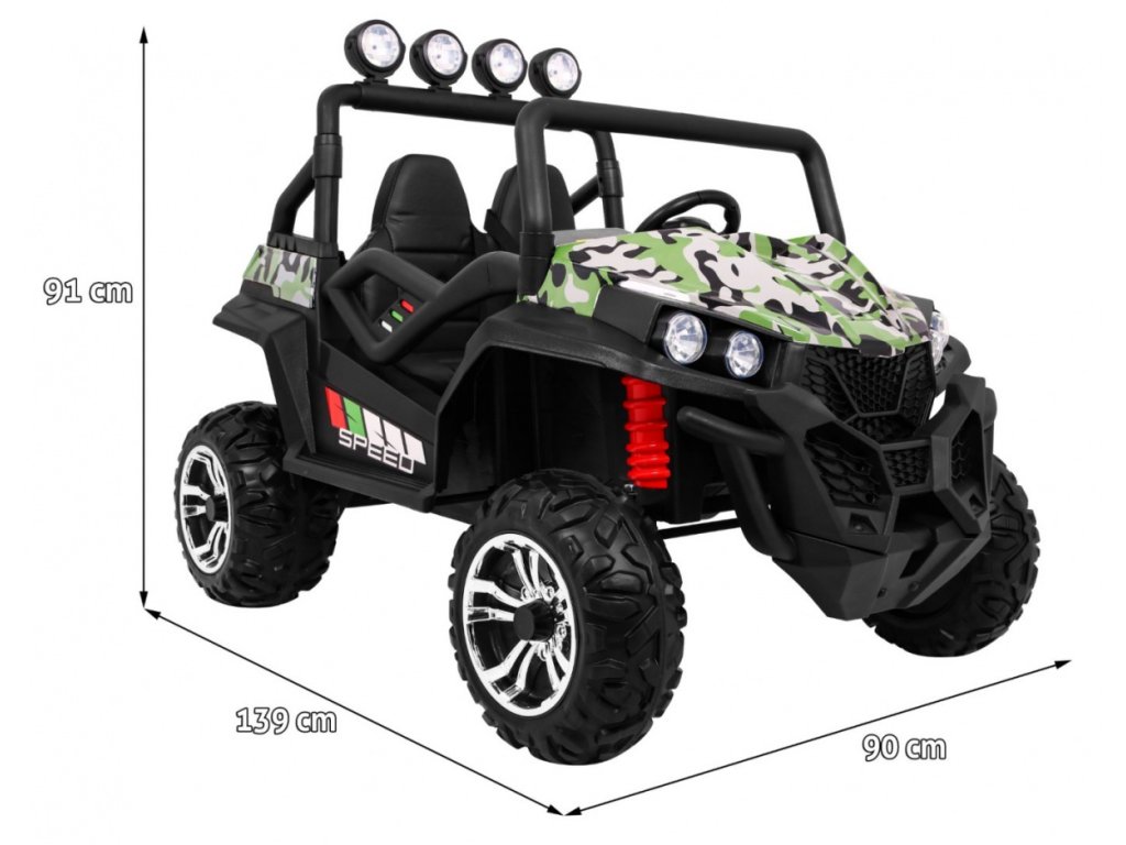 Детско акумулаторно бъги Buggy Strong Lift 24V 4x4 камуфлажно идва с меки пянообразни EVA гуми, които заедно с мощния електрически мотор 4x45W и батерия 24V 7Ah преодоляват различни тежки терени.