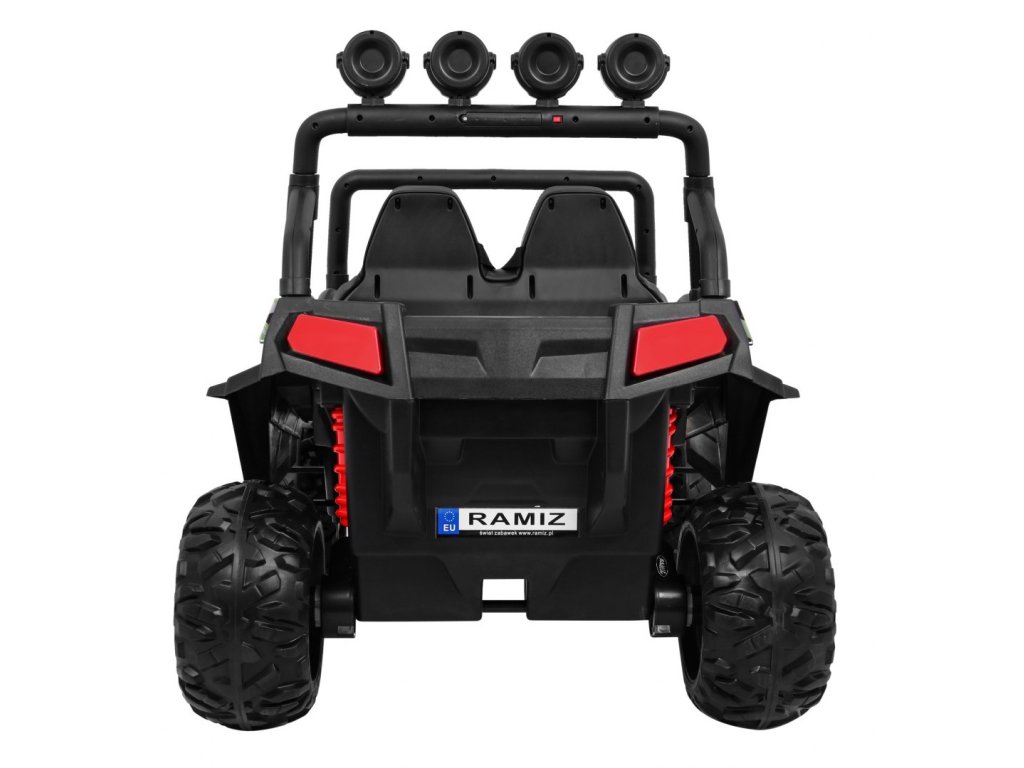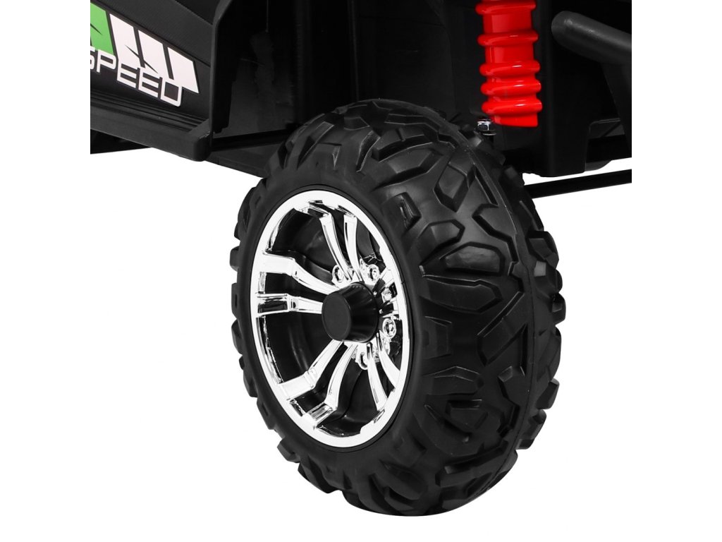 Сред богато оборудване са предни LED светлини, задни амортисьори и музикален панел с входове за MP3, SD, AUX и FM радио. Колелата са изработени от подсилена EVA пяна, осигуряващи тиха и плавна игра. Двуместното седалка е направено от дишаща екологична кожа.