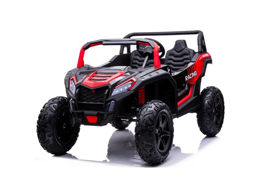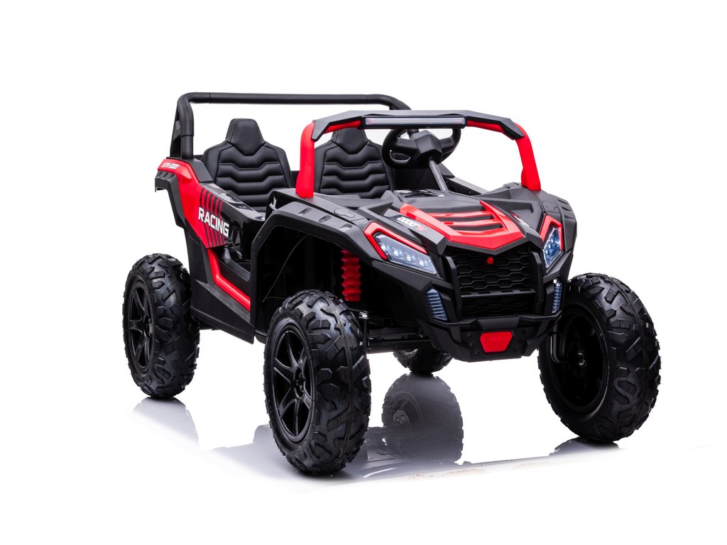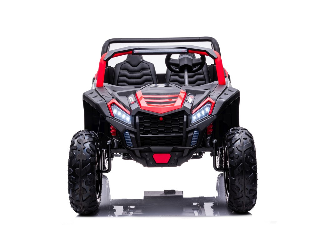 Акумулаторно бъги Buggy UTV Strong 24V с надуваеми гуми червено впечатлява със здравите си надуваеми колела и товароносимост до 100 кг. Благодарение на високата товароносимост и размерите на бъгито, в него удобно могат да се настанят две деца. Седалката е изработена от екологична кожа.