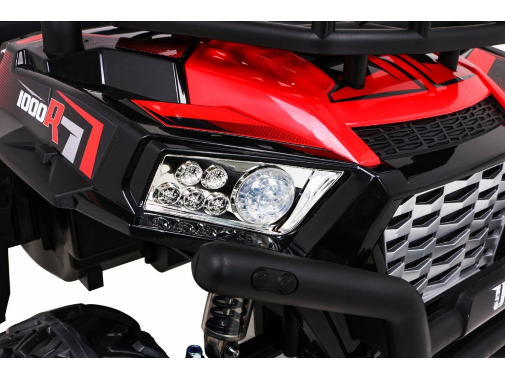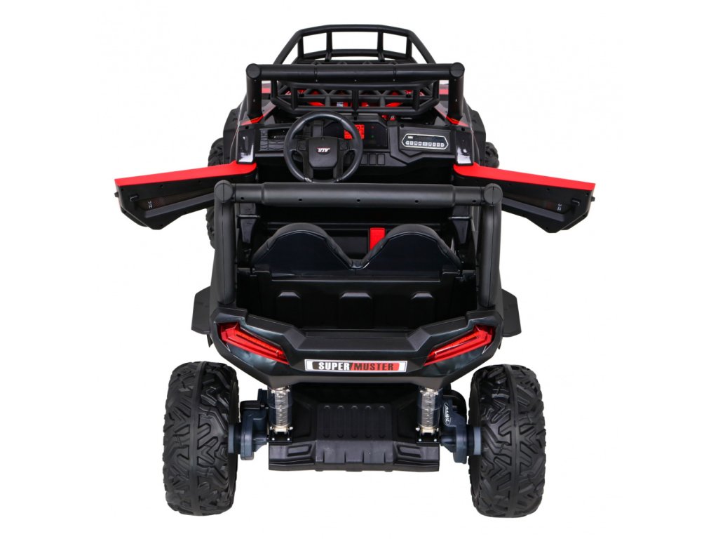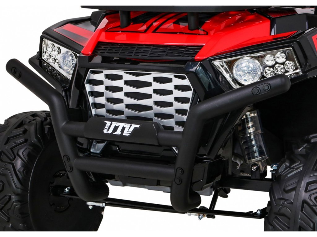 Детско акумулаторно бъги UTV червено с два мощни електрически мотора 200W. Бъгито лесно се справя с всякакъв терен. В седалката от мека екологична кожа удобно могат да се настанят дори две деца, тъй като бъгито поддържа товароносимост до 50 кг.