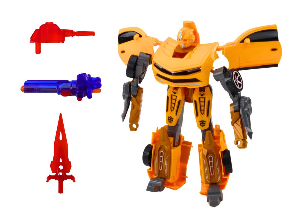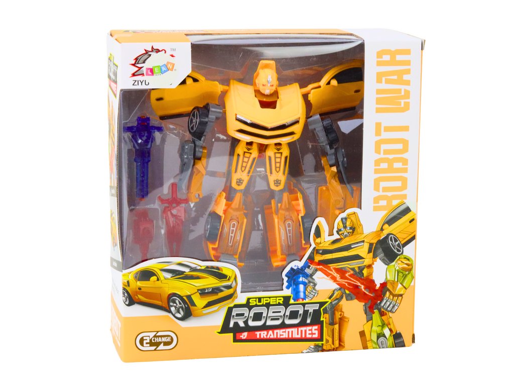 Авто-робот 2в1 е изключителен модел, който съчетава елегантността на спортен състезателен автомобил с внушителната фигура на голям робот. В жълт цвят впечатлява със своето детайлно изпълнение,