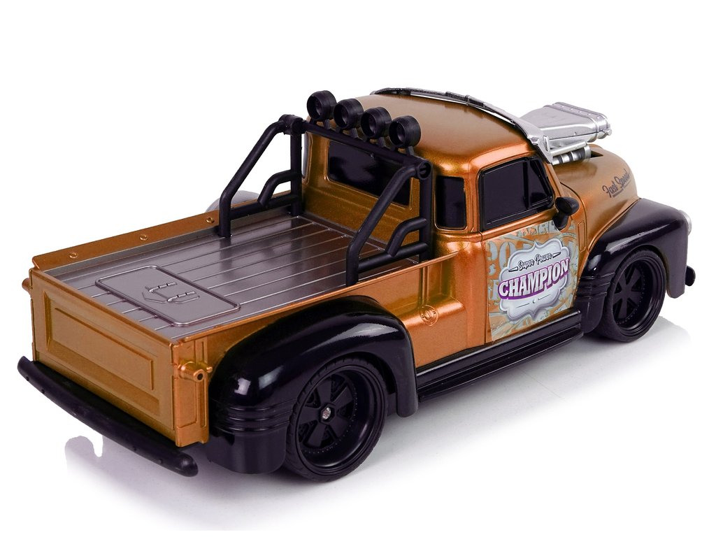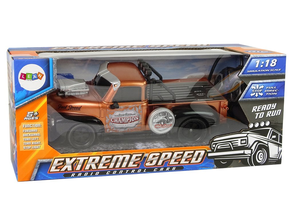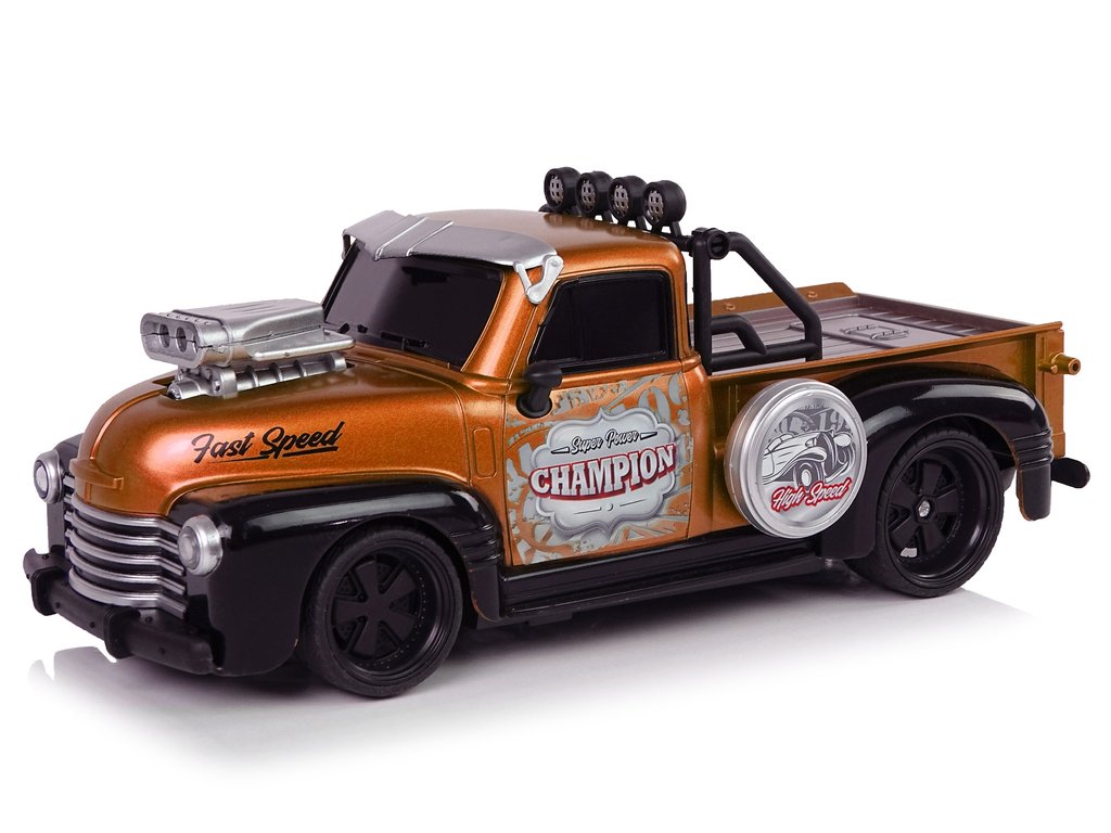 Автомобил пикап с дистанционно управление R/C 1:18 кафяв определено ще зарадва всеки фен на тези превозни средства. Колата е изработена от пластмасови части, а гумените гуми осигуряват по-добро сцепление с повърхността. В комплекта е включено и дистанционно управление, което позволява управлението на автомобила напред, назад и встрани.