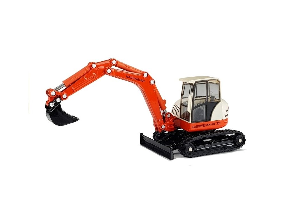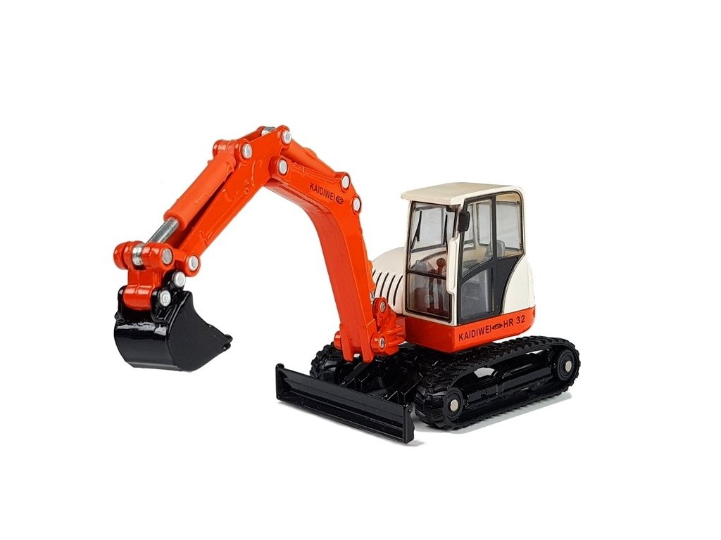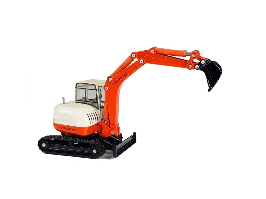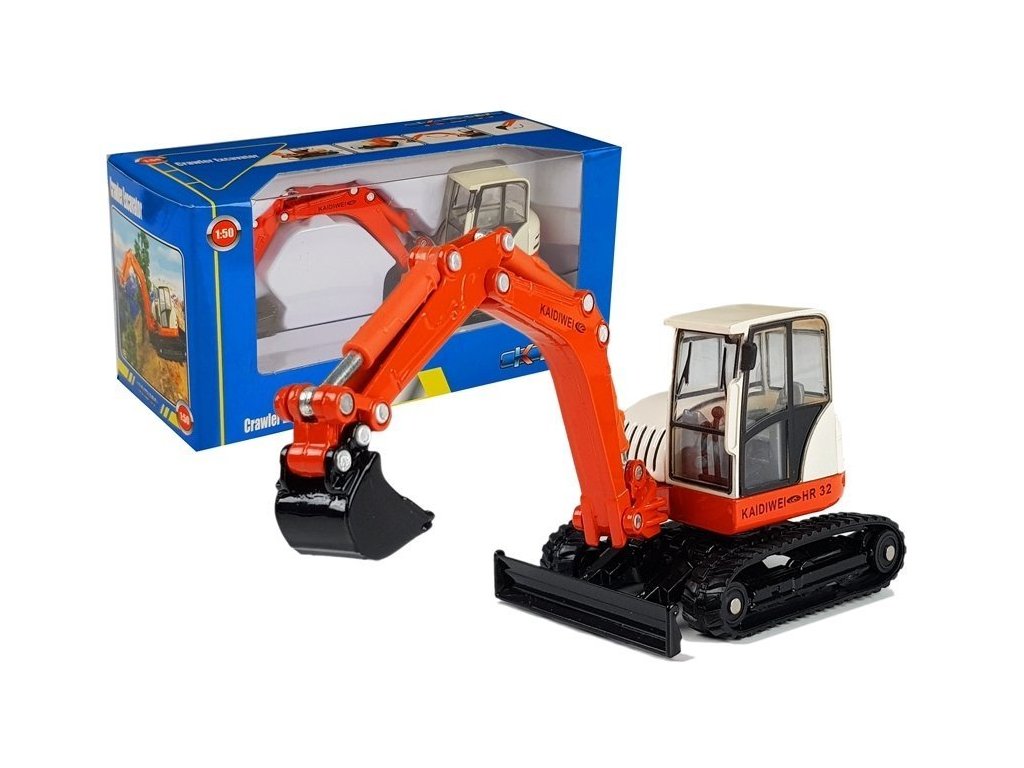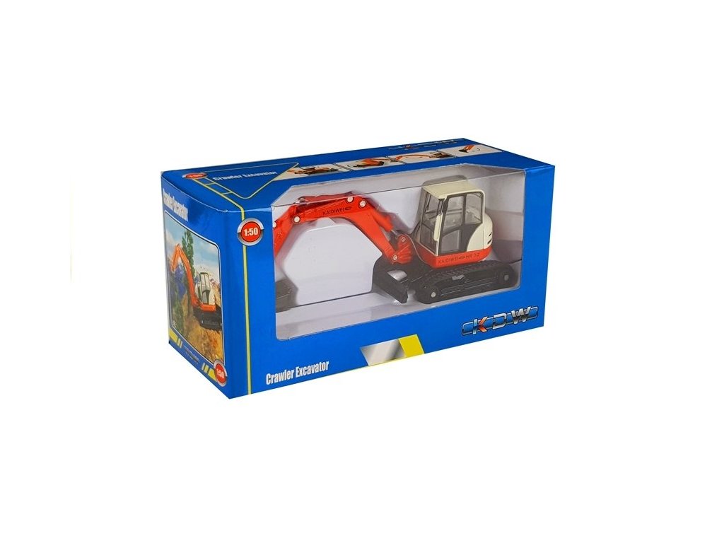 Багер 1:50 червен с подвижна стрела е изработен в мащаб 1:50. Кабината, която се върти около собствената си ос, е монтирана върху гумени писти. Превозното средство се задвижва чрез инерционен механизъм.
