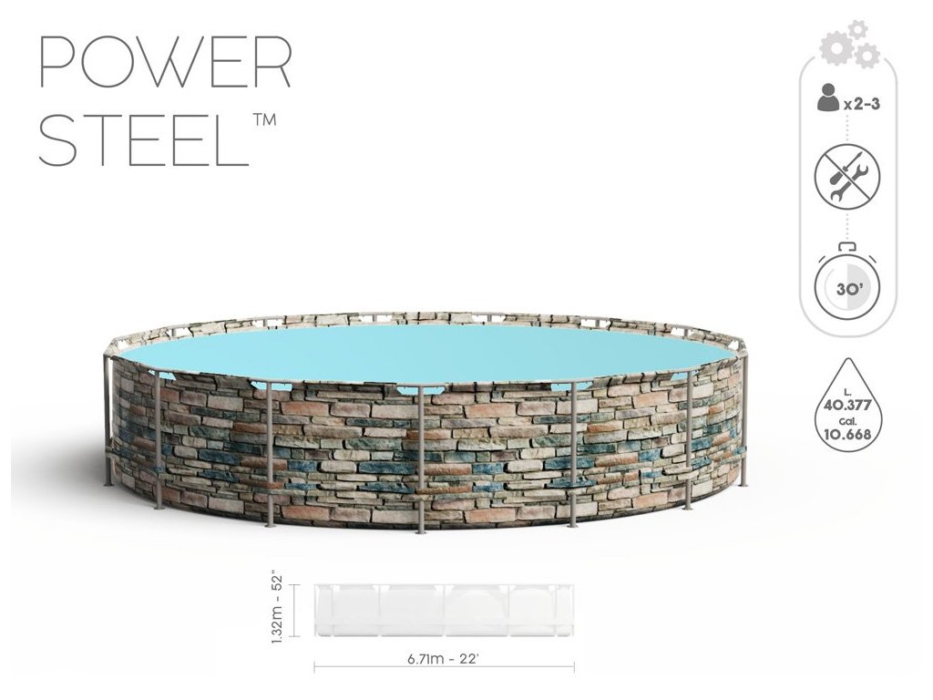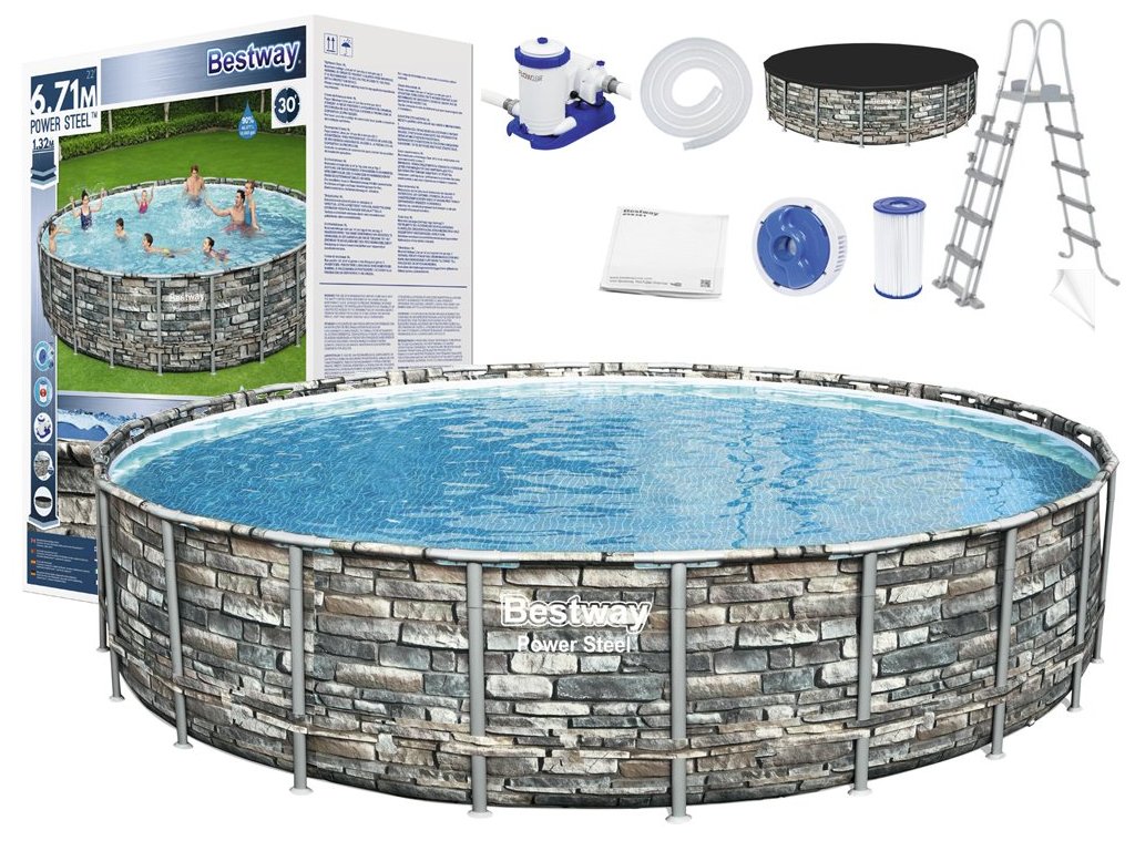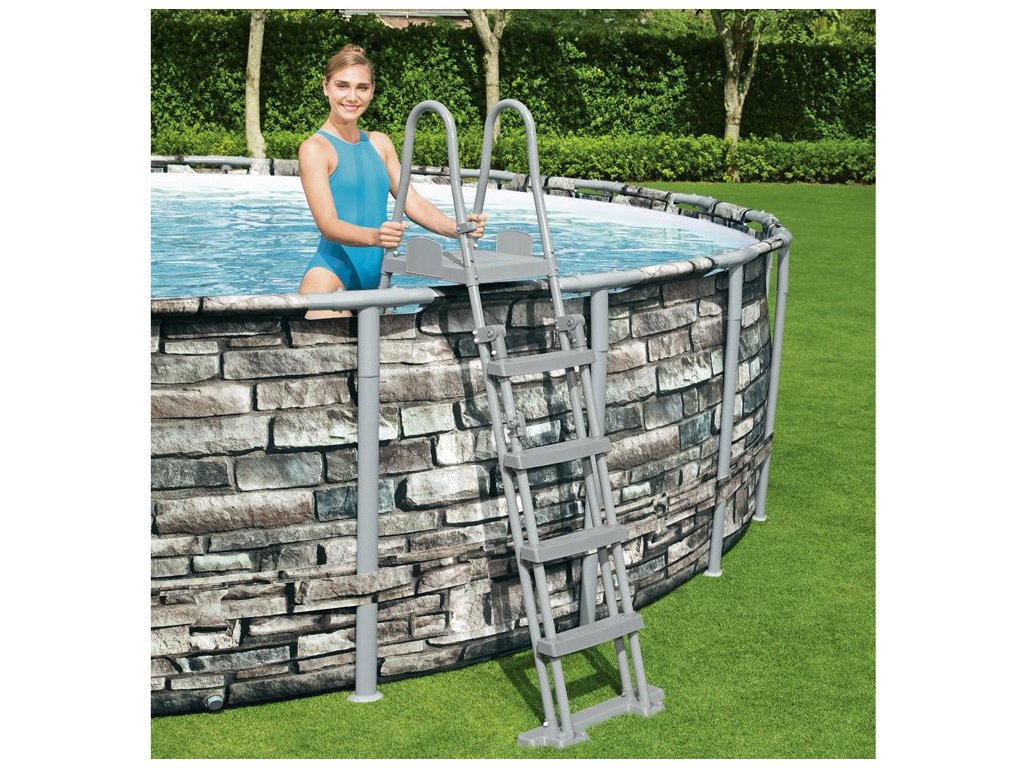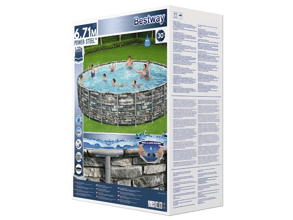 Басейн Bestway Power Steel 671x132 см се предлага с филтърна помпа, покривало и безопасна стълба. Стълбата е повдигната, за да предпази децата от достъп до басейна без надзор, стъпалата са покрити с нехлъзгащ се материал, а ръкохватките са удобни и стабилни.