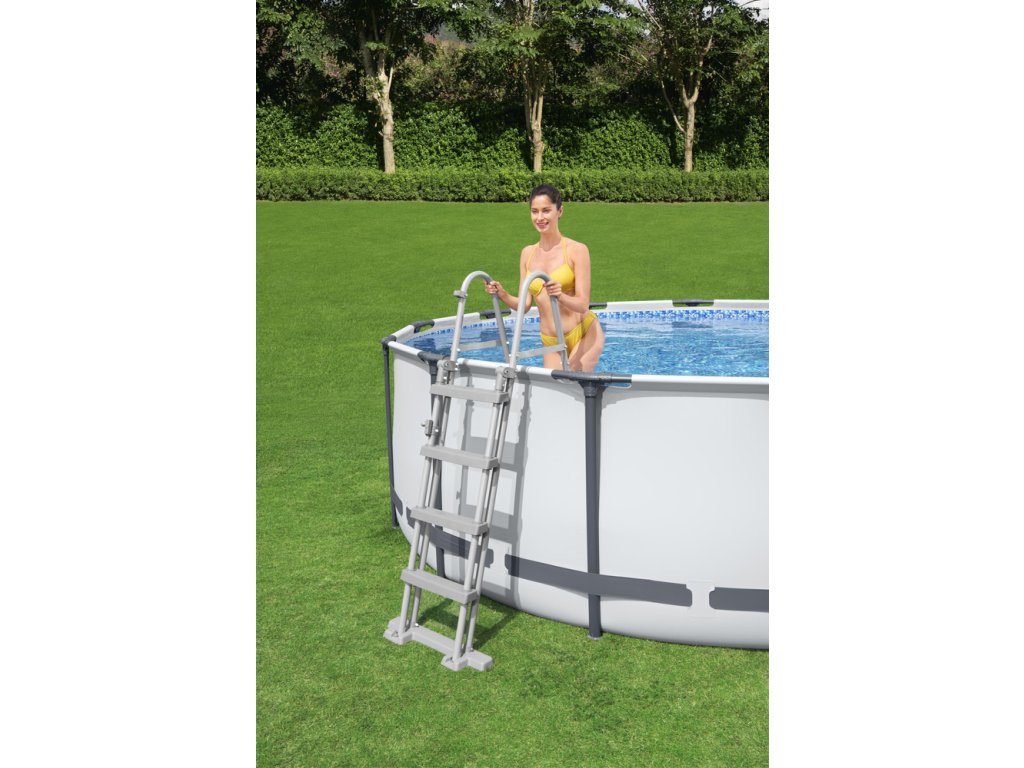 Басейнът е оборудван също с удобна и безопасна стълба, която разполага с функция за повдигане на стъпалата нагоре. По този начин децата няма да могат да влизат в басейна без родителски контрол.