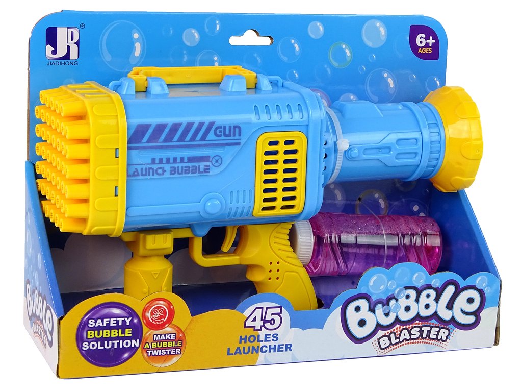 Размери на базуката: 28 см x 17 см x 9 см и разполага с 45 отвора за балончета.