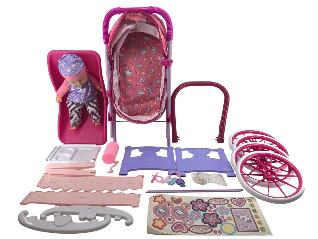 Голям комплект за игра за малки майки – включва кукла, части за сглобяване на количка, легло, столче за кола и други аксесоари. Детето може да сглоби различни варианти за грижа за бебето, да го вози, да го приспива и носи. Включени са и стикери за украса. Играчката е подходяща за деца от 3 години.