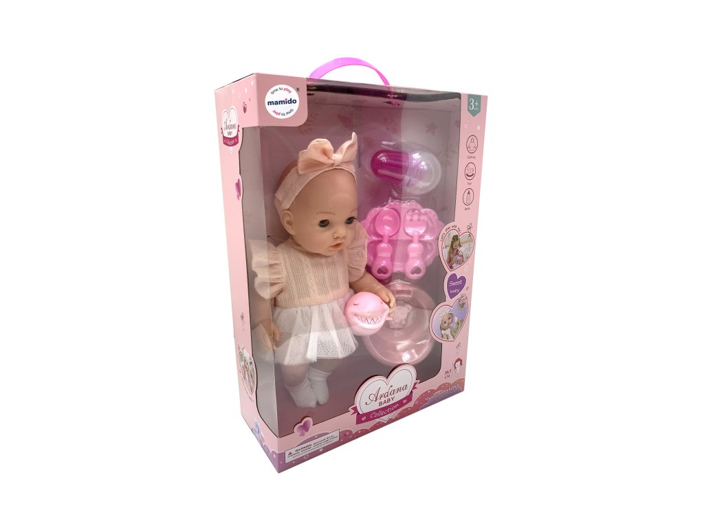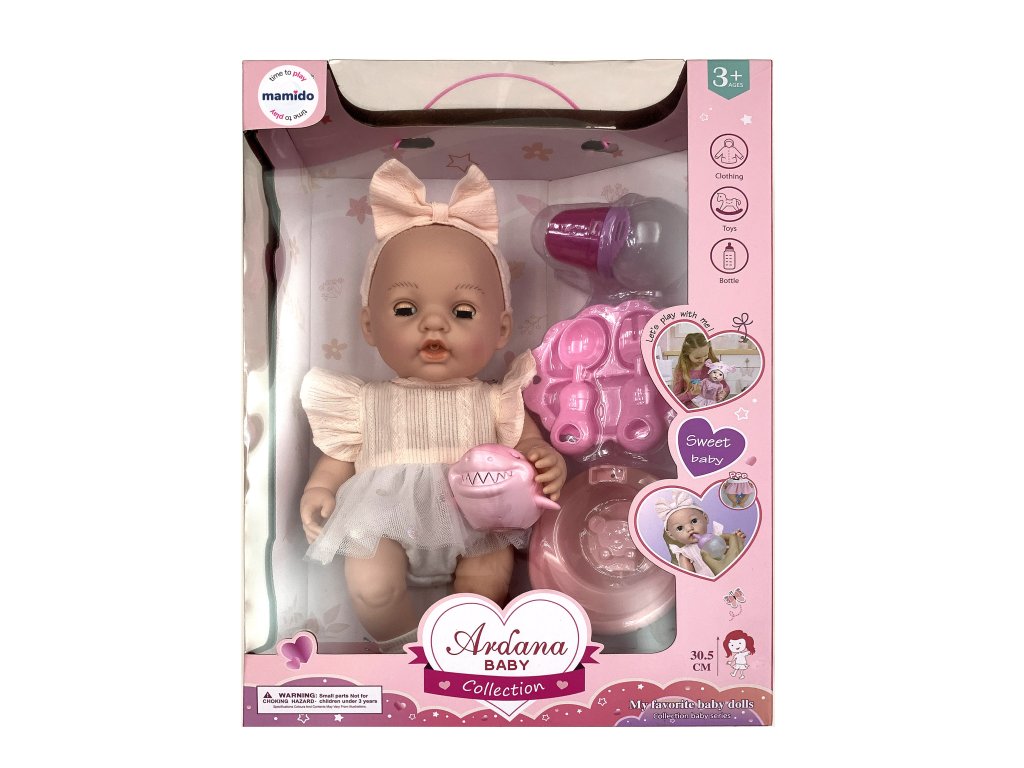 Бебето в розови дрешки носи на децата свят на нежна грижа, игри на семейство и развиване на въображението. Куклата има фини черти, меко тяло и благодарение на размера си от 30,5 см се държи чудесно и от по-малки деца. Част от комплекта е богата гама от аксесоари, които позволяват хранене, преобличане и игра – има шише, гърне, комплект прибори и сладка играчка във формата на акула.