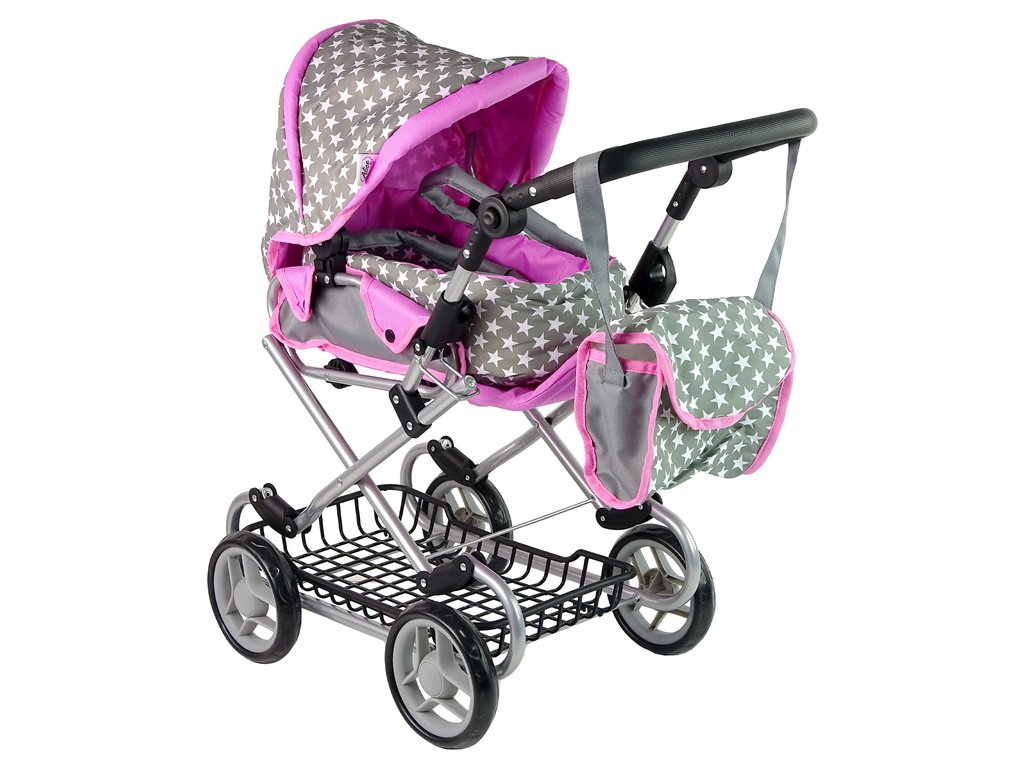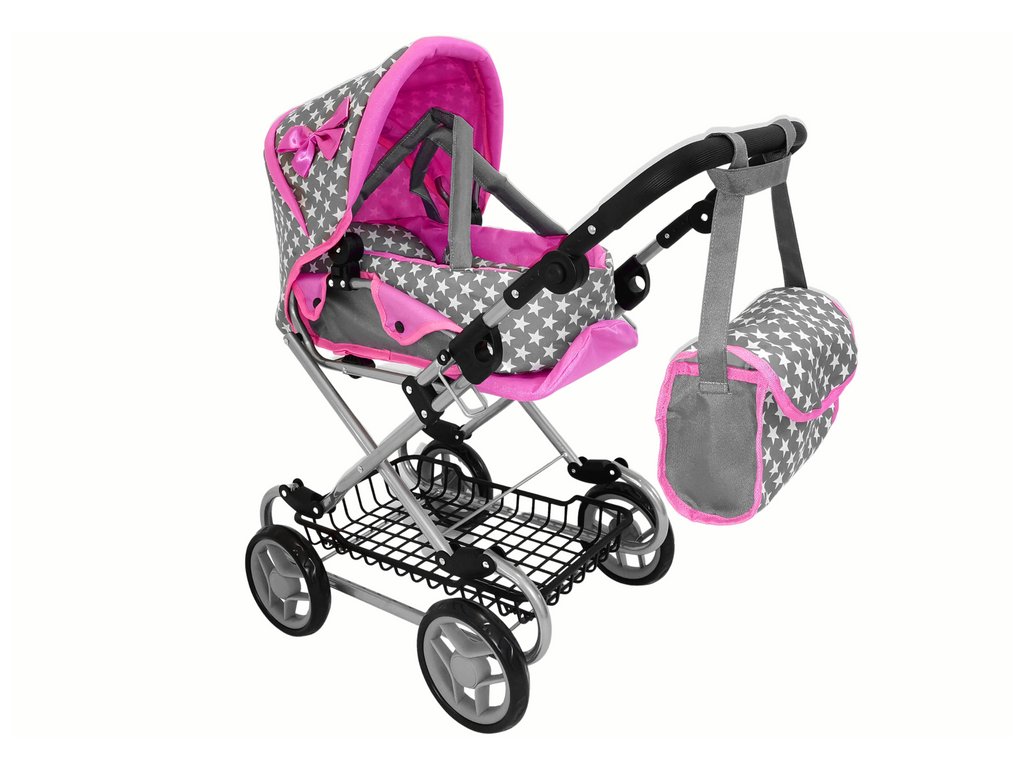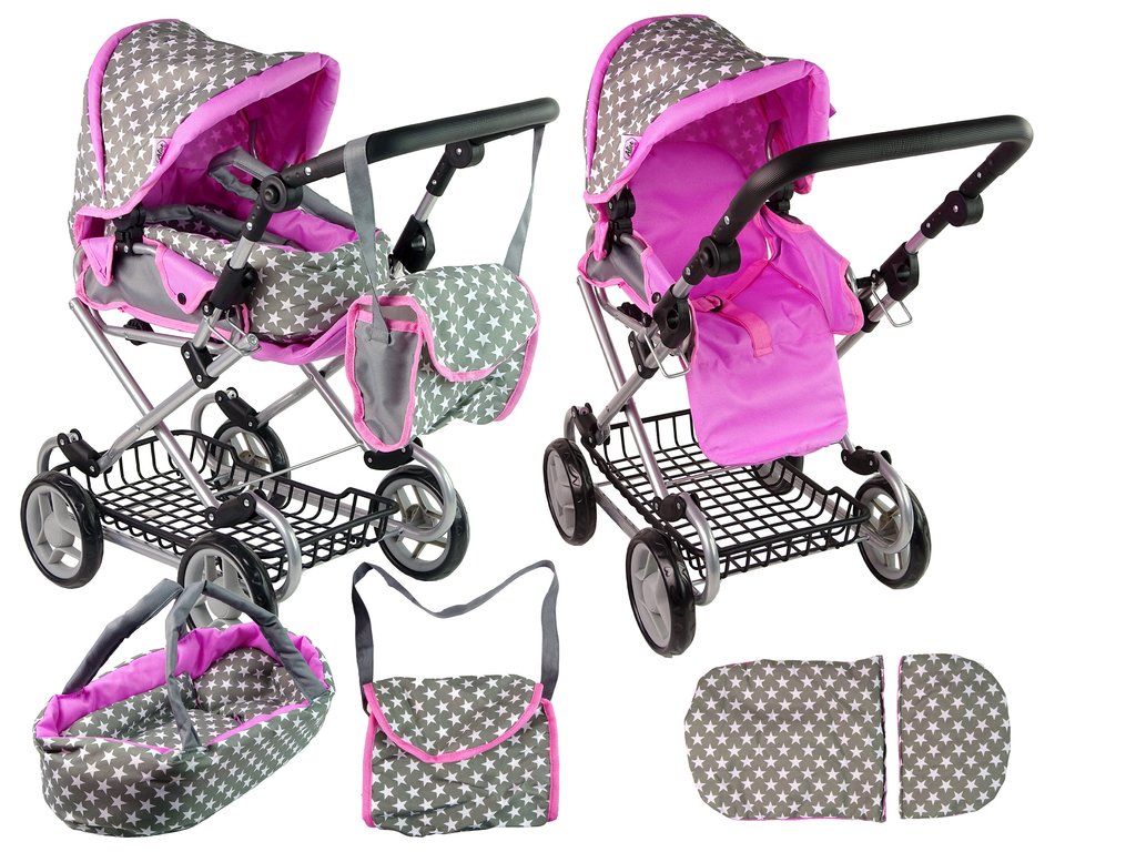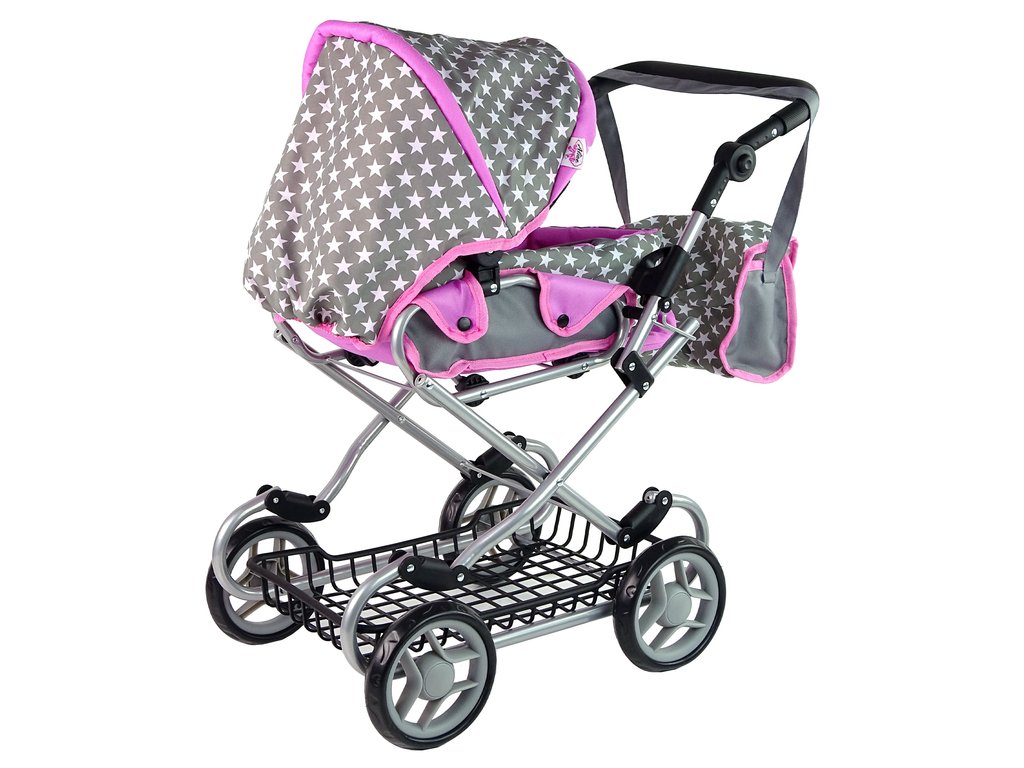Бебешка количка за кукли 2в1 с чанта и раница розова в сив цвят с бели звездички, които придават очарование. Дизайнът й имитира реален модел, което добавя реализъм. Конструкцията е изработена от здрави и издръжливи алуминиеви тръби със сребрист цвят, свързани с черни пластмасови съединители. Фините пластмасови материали, използвани за изработката на количката, гарантират комфорт и удобство при игра, което в комбинация с поставянето на количката върху четири тесни колела улеснява управлението и маневрирането с нея.