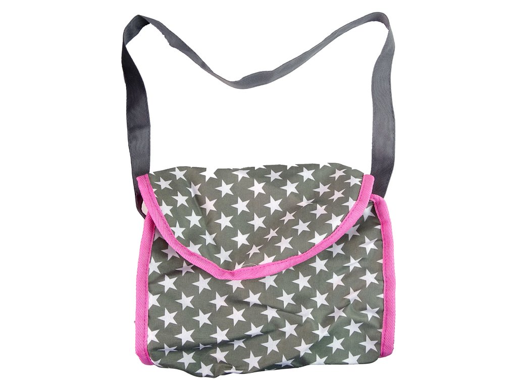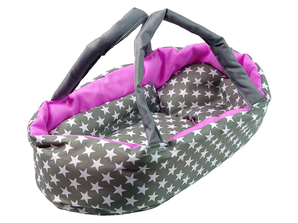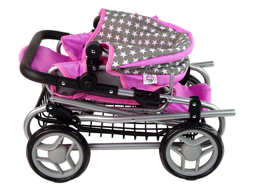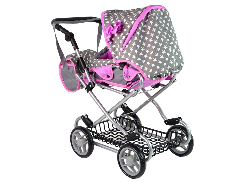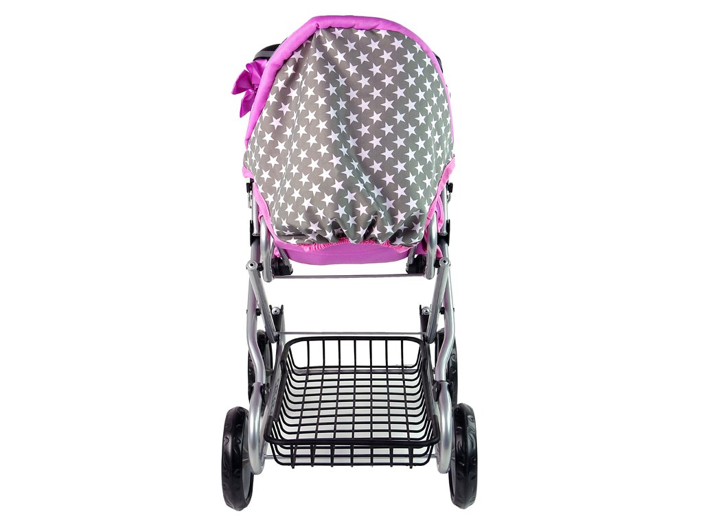 Бебешка количка за кукли 2в1 с чанта и раница розова в сив цвят с бели звездички, които придават очарование. Дизайнът й имитира реален модел, което добавя реализъм. Конструкцията е изработена от здрави и издръжливи алуминиеви тръби със сребрист цвят, свързани с черни пластмасови съединители. Фините пластмасови материали, използвани за изработката на количката, гарантират комфорт и удобство при игра, което в комбинация с поставянето на количката върху четири тесни колела улеснява управлението и маневрирането с нея.