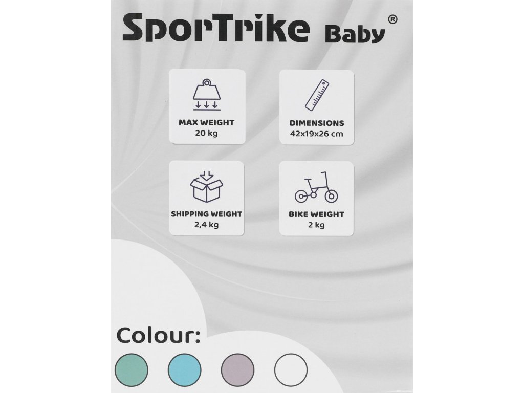 Бебешки баланс велосипед SPORTRIKE PettyTrike бял е безопасен, удобен и цветен баланс байк за деца, който помага на малките да усъвършенстват равновесието и моторната координация, необходими за прехода към класически колело. Специално проектираната рамка е подходяща за деца от 1 година. Големите колела, антислип волан и удобна седалка осигуряват комфорт по време на каране.