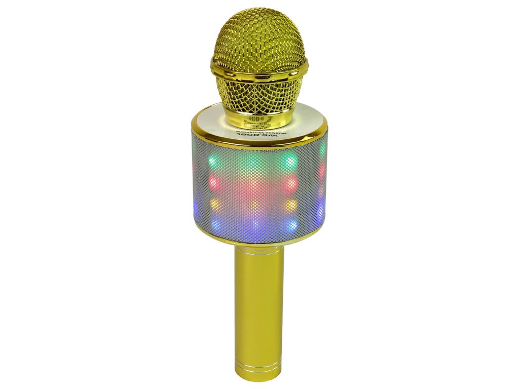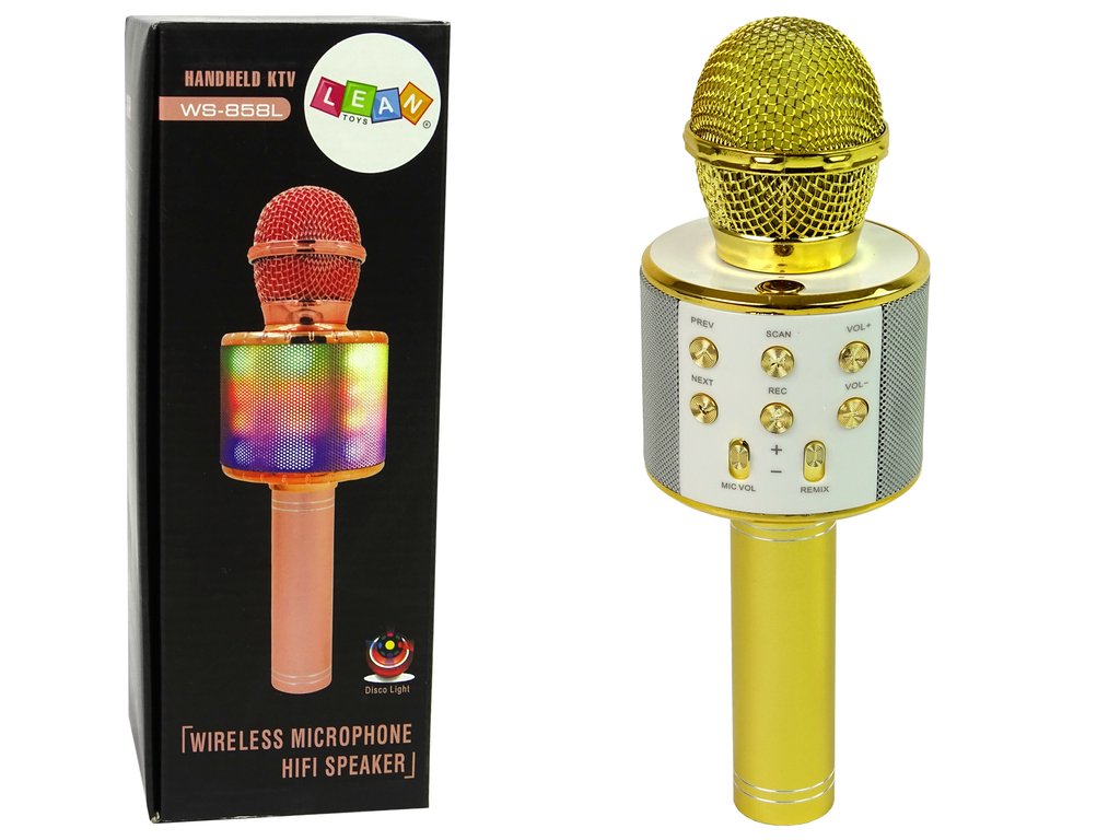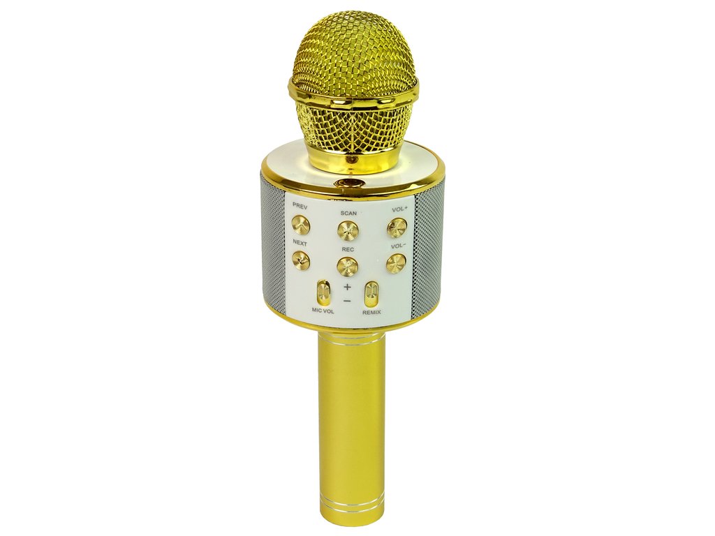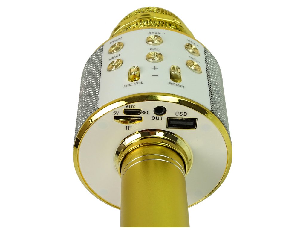 Безжичен караоке микрофон WS-858 златен е изключително лесен за използване - просто го свържете чрез Bluetooth с външно устройство – мобилен телефон или лаптоп и възпроизвеждайте музика. Вградените два високоговорителя осигуряват отлично озвучаване. След свързване с друго устройство, той възпроизвежда музика.