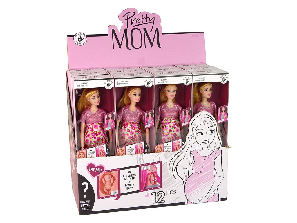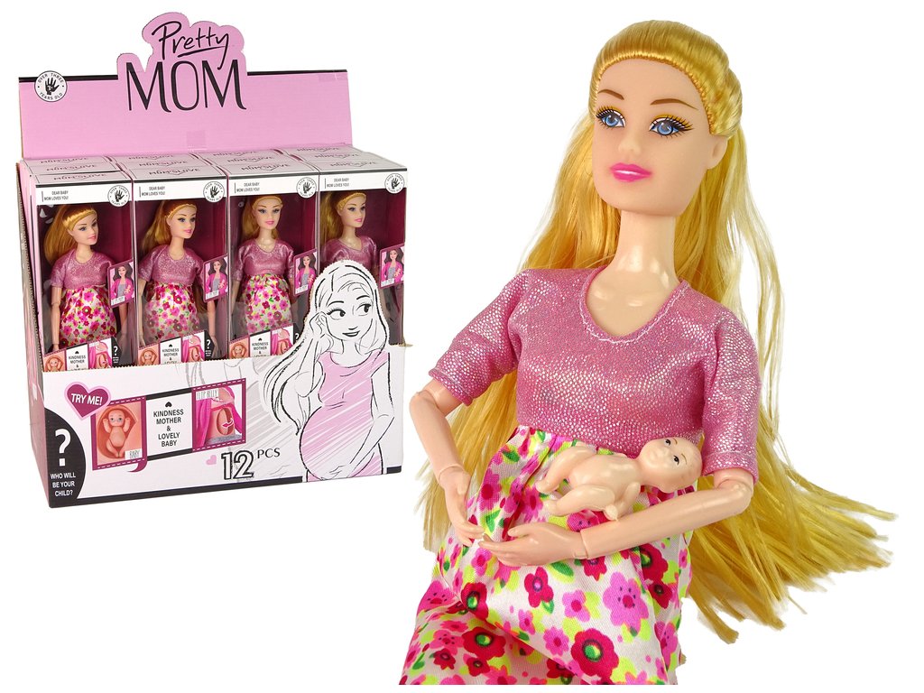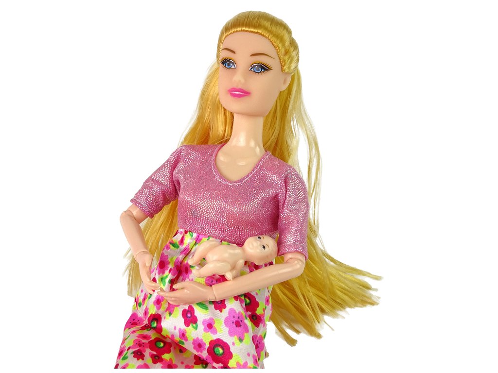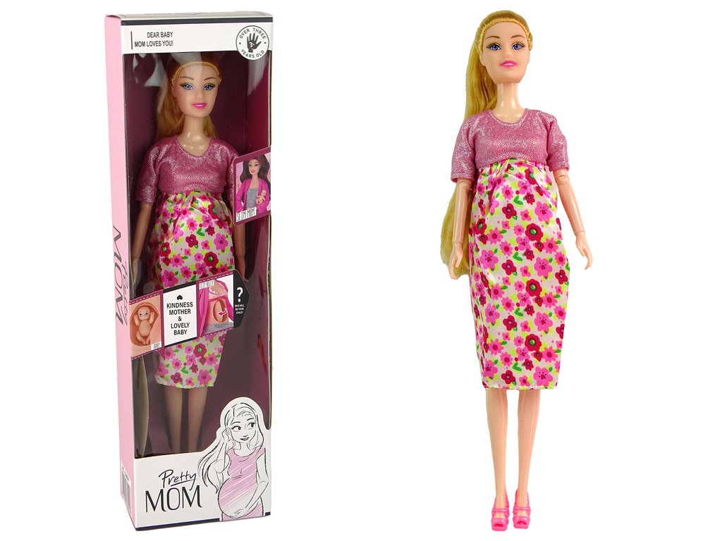 Бременна кукла в розова рокля с цветя има дълга красива руса коса, сплетена в сладка опашка. Розовата й рокля с цветен десен и розовите високи токчета й придават чар и стил. Тази играчка е идеална за домашни игри и създаване на семейни моменти с куклите.