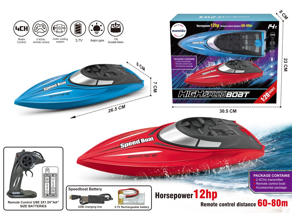 Изживейте вълнуващо пътуване по водната повърхност с RC лодка в мащаб 1:20, която съчетава висока производителност, атрактивен дизайн и лесна употреба. Благодарение на мощния двигател и 2,4 GHz система, лодката е стабилна, бърза и управляема на разстояние до 60–80 метра.