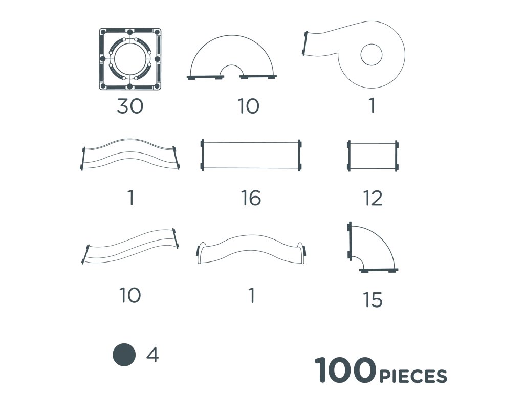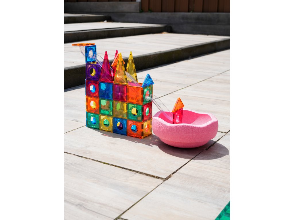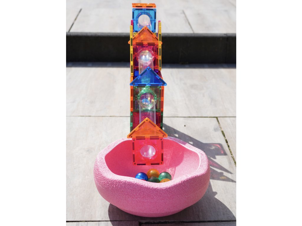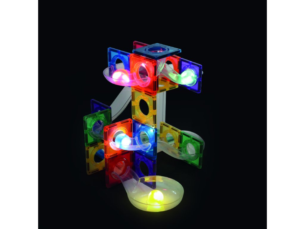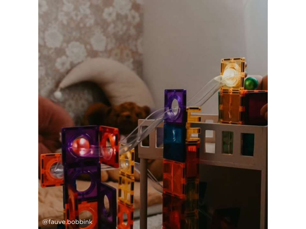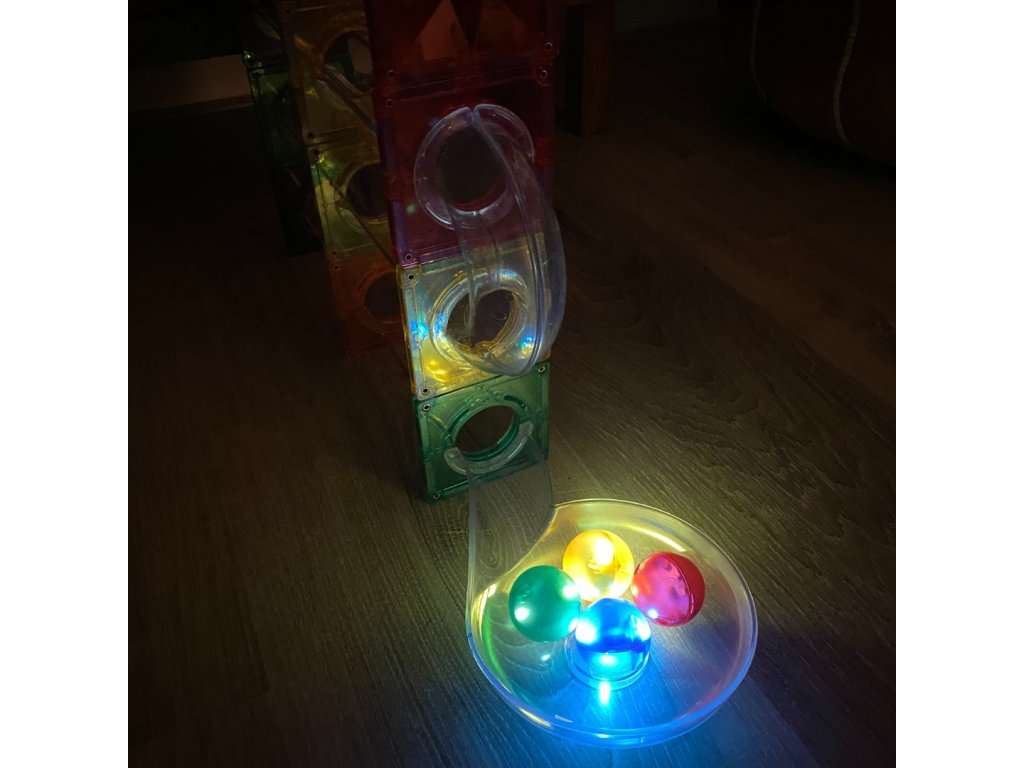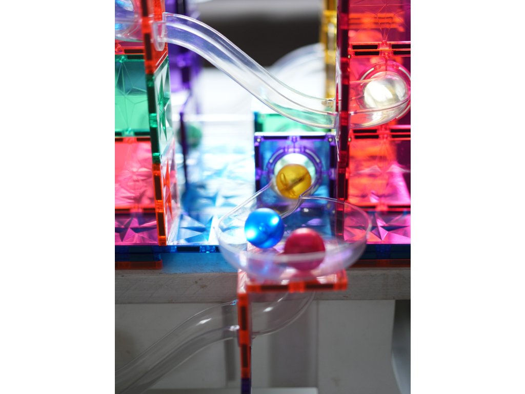 Сглобяването е лесно и забавно. Частите се свързват с помощта на силни магнити, а след това просто добавяте тунели и завои, по които топчетата ще се движат.