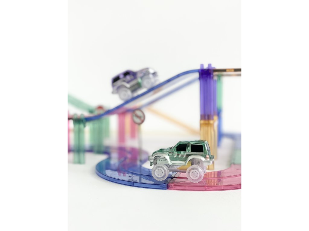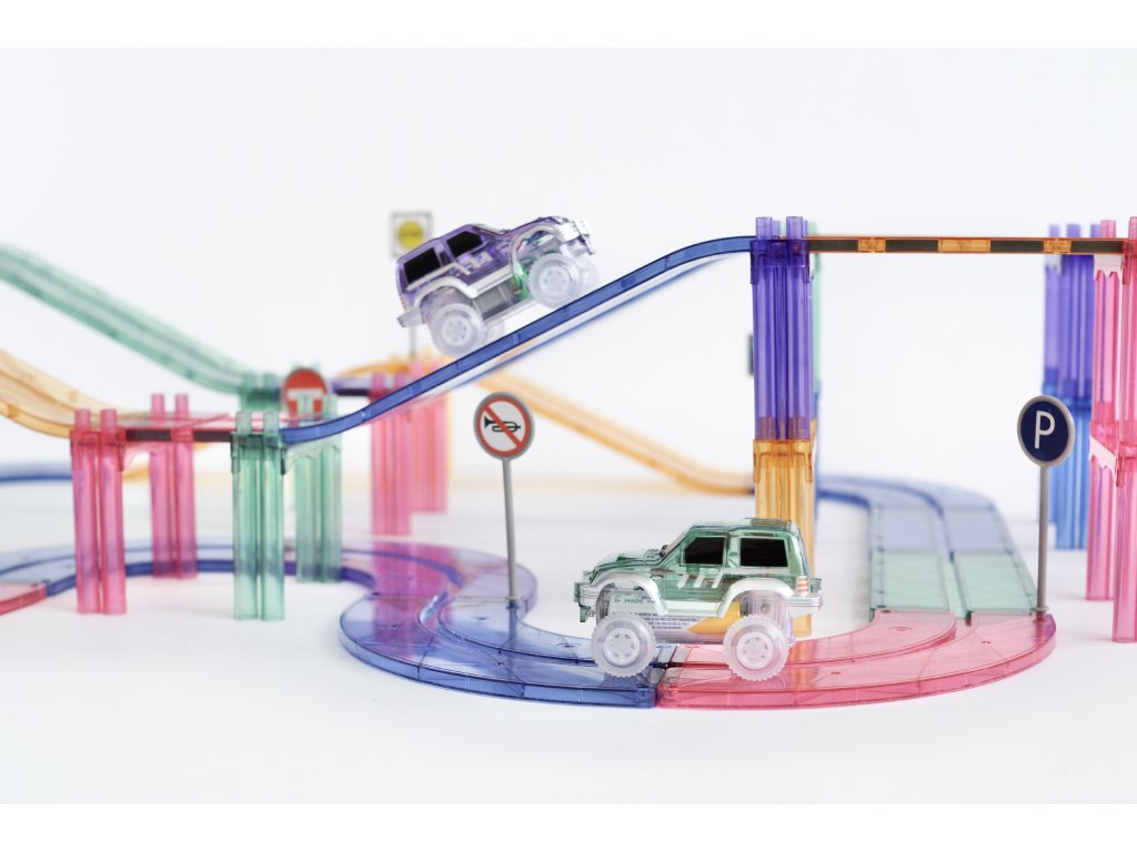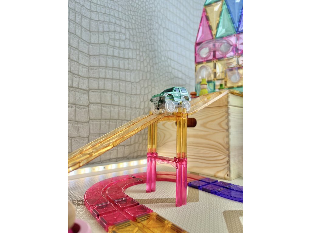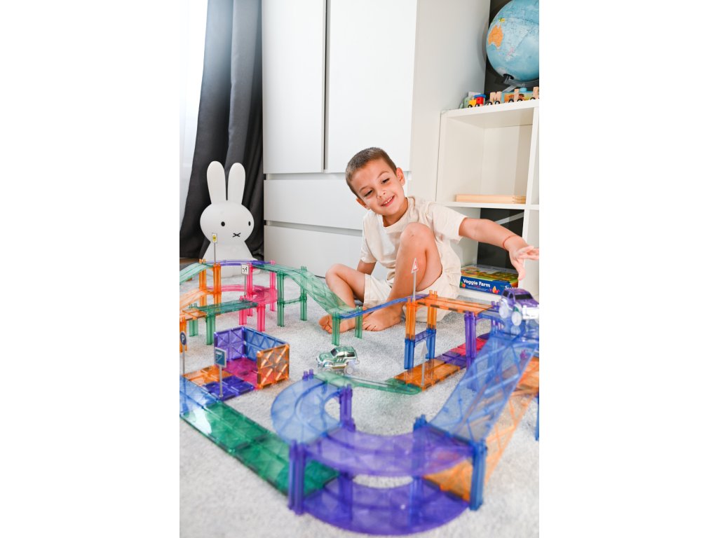 Потопете се в света на меките пастелни цветове и безкрайното забавление! Магнитната писта Cleverclixx в пастелна серия не само привлича с красив дизайн, но и предлага часове творческа игра. Децата могат да създават състезателни трасета, градски улици или завъртяни пътечки – всичко това лесно благодарение на магнитното свързване на детайлите.