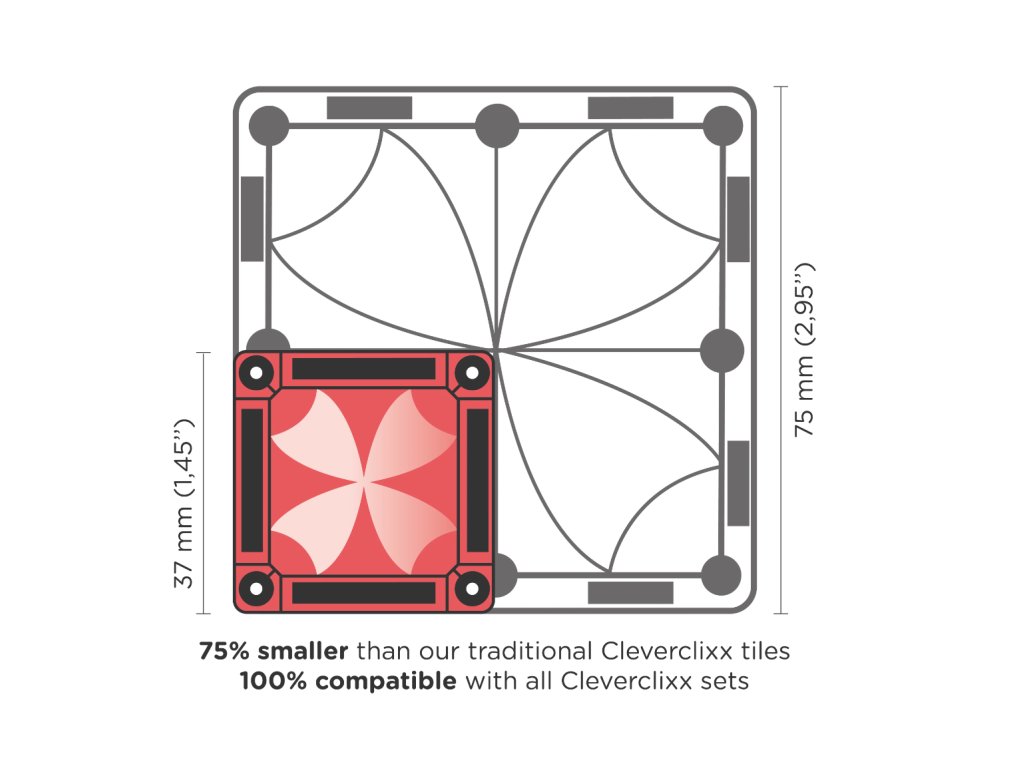 Този мини комплект подпомага развитието на STEAM умения (наука, технологии, инженерство, изкуство и математика) чрез свободна игра. Децата се учат да разпознават форми, да строят стабилни конструкции и да мислят логически – и всичко това по игрив начин. Всички комплекти Cleverclixx също са взаимно съвместими, така че Mini Tiles Pack лесно ще допълни всяка съществуваща колекция.