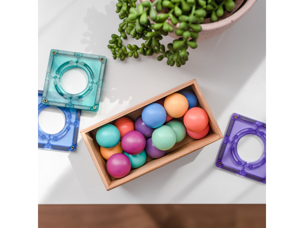 Още повече цветове и динамика! Те са съвместими с Connetix Tiles, но могат да се използват и самостоятелно за свободна игра. Дървените топчета са проектирани да предоставят на децата визуално удоволствие по време на игра.