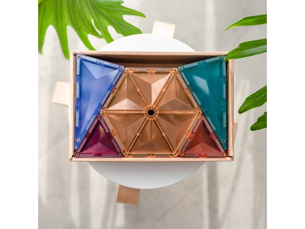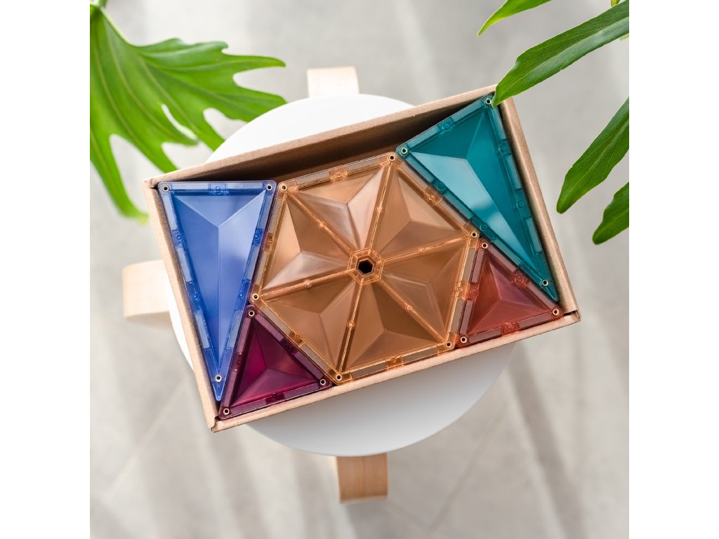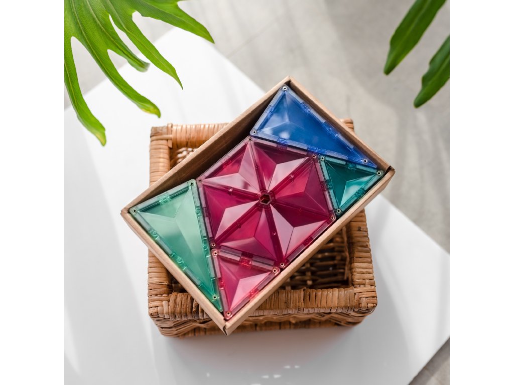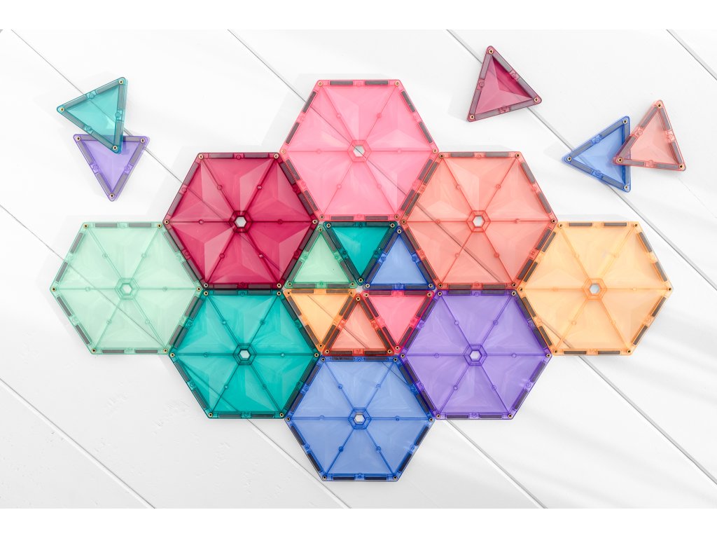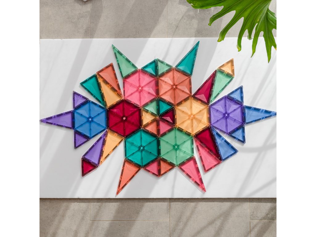 С този невероятен комплект магнитни елементи Connetix Плочки в вариант Геометрия децата могат да създават завладяващи геометрични фигури и да откриват света на формите. С пастелни шестостени, равностранни и равнобедрени триъгълници те могат да изграждат безкрайни структури, които подпомагат тяхното въображение и логическо мислене. Всеки модул се свързва лесно чрез магнити, което позволява на децата да създават стабилни конструкции с минимални усилия.