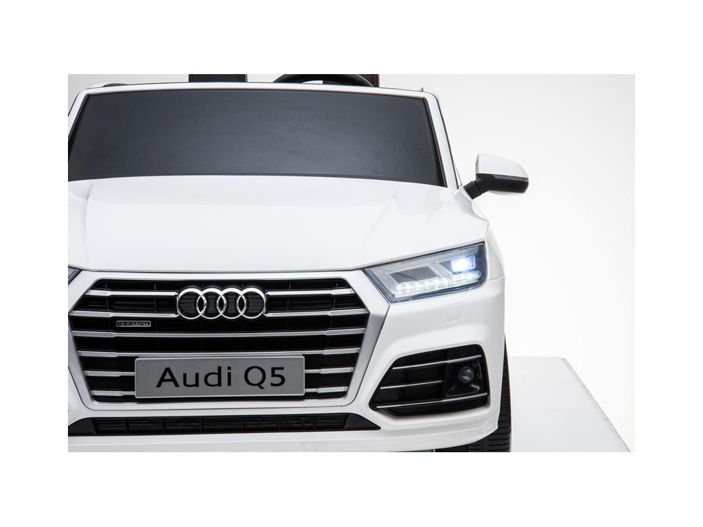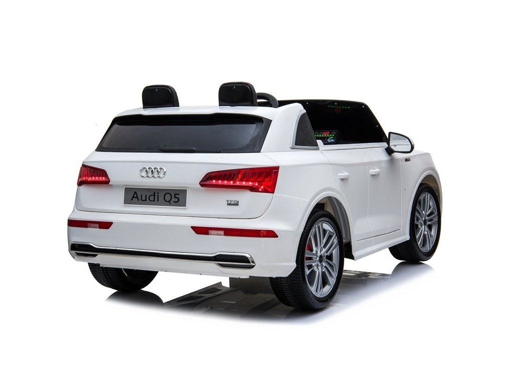 Детска акумулаторна кола Audi Q5 4x4 LCD бяла, която привлича вниманието на всички около нея. Детска акумулаторна кола Audi Q5 4x4 е голяма, мощна и изработена от висококачествена пластмаса. Кола може да се управлява чрез дистанционно управление или детето да шофира самостоятелно. Колата разполага с удобна седалка от еко кожа и отварящи се врати, а за безопасността на детето има обезопасителен колан на седалката. Детската акумулаторна кола е оборудвана с LED предни и задни светлини, музикален панел и реалистични звуци.