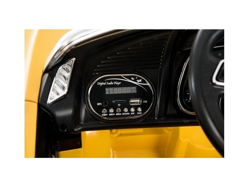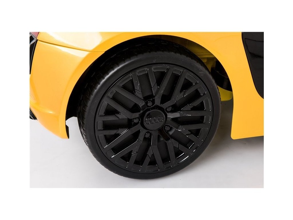 Детска акумулаторна кола Audi R8 Spyder жълта лакована идва с меки пенирани EVA гуми, които са тихи и се адаптират към различни терени. Детето сяда на удобно оформено седалка от екологична кожа, а за безопасността се грижат предпазните колани.