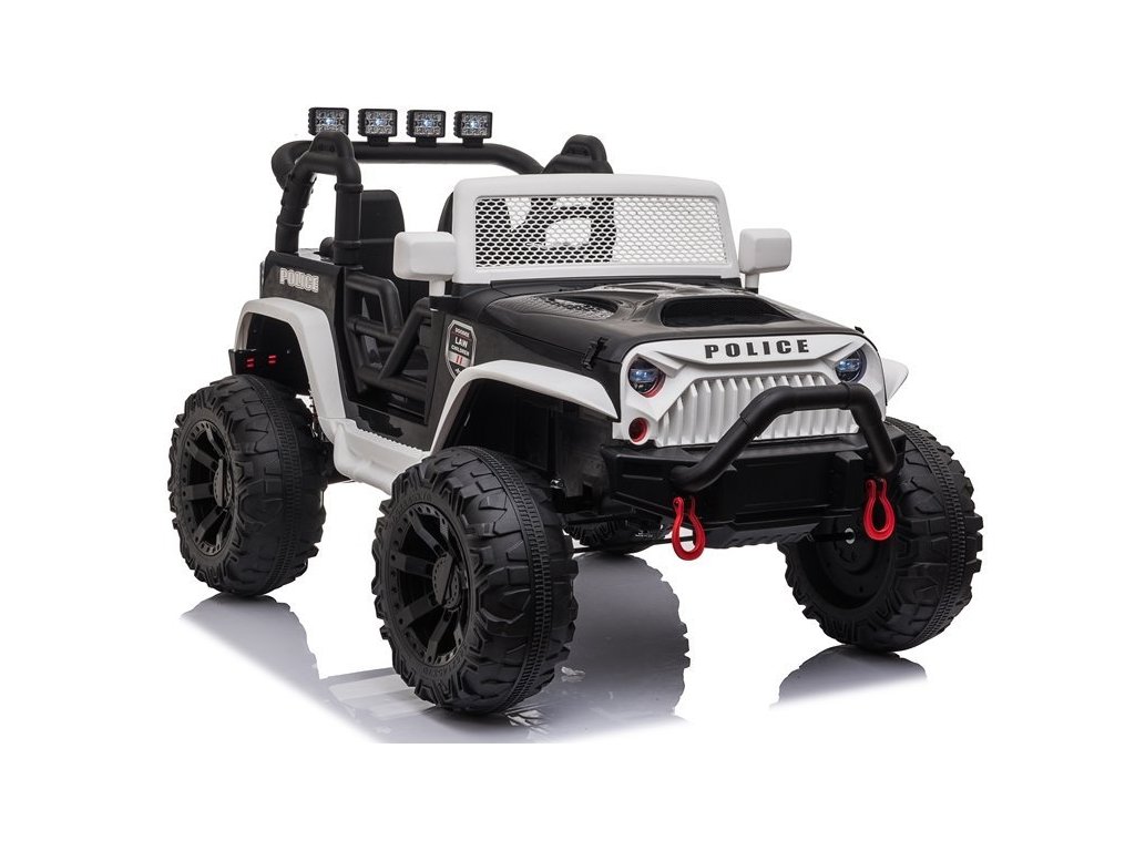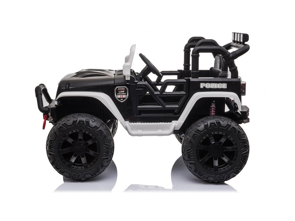 Детска акумулаторна кола Jeep Power Полиция черно-бяла с ултрависокоефективен електрически мотор 200W идва с големи безшумни пяни EVA гуми, които осигуряват стабилност и сцепление на различни терени. Колата е оборудвана с LED светлини и удобна седалка от мека, екологична кожа. Музикалният панел разполага с входове за MP3, USB и SD карти, както и възможност за свързване чрез Bluetooth.