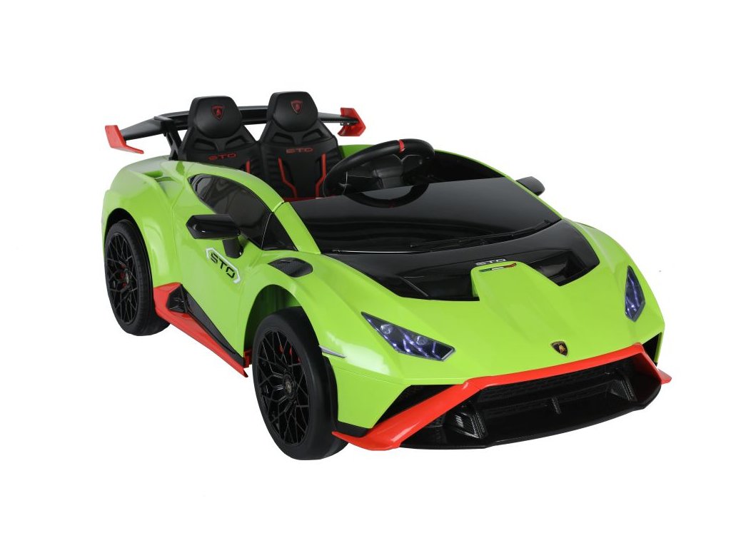 Детска акумулаторна кола Lamborghini Huracán STO зелена разполага с два мотора с мощност 45W, което означава, че автомобилът има двойно задвижване 2x2. За комфортно шофиране се грижат предните пяни EVA гуми. На детето ще му хареса музикалният панел с входове за SD карта, USB и Bluetooth. Максималното натоварване на количката е 30 кг. Кола разполага с предно и задно LED осветление и отварящи се врати.