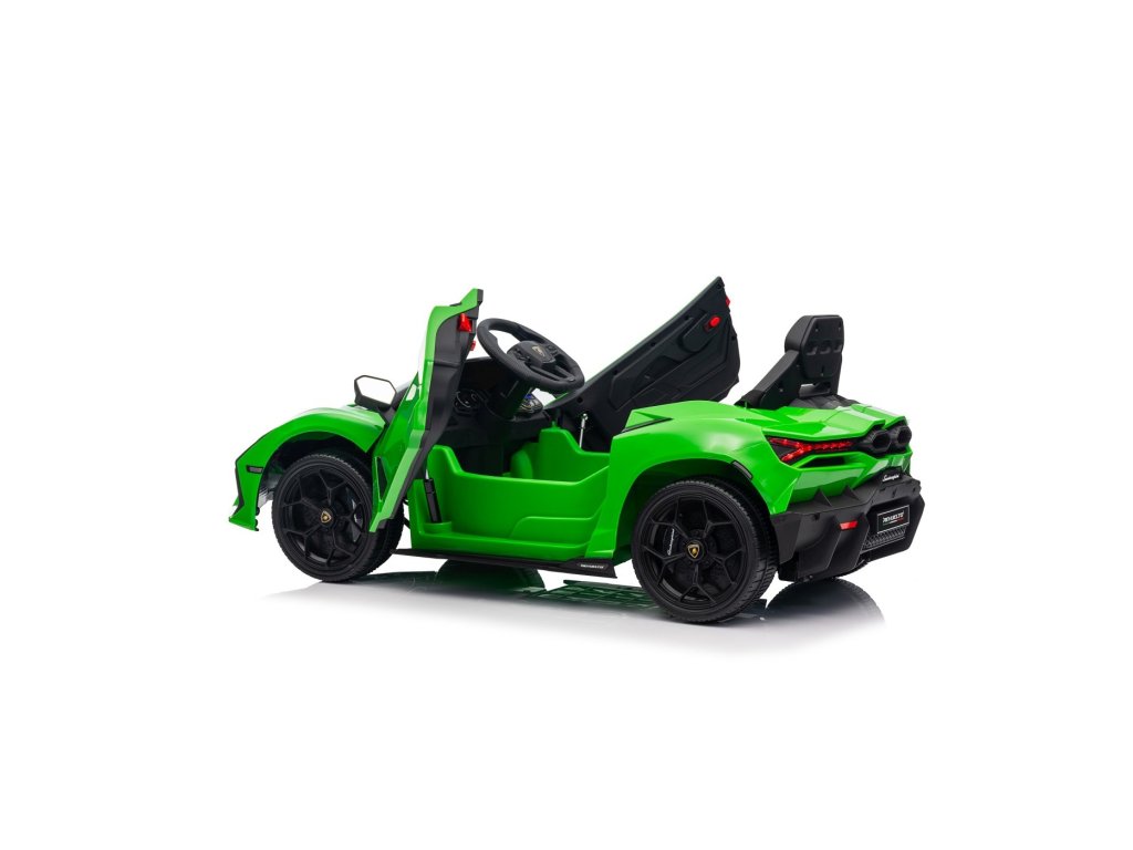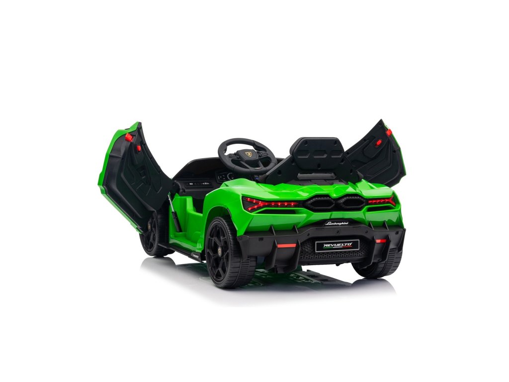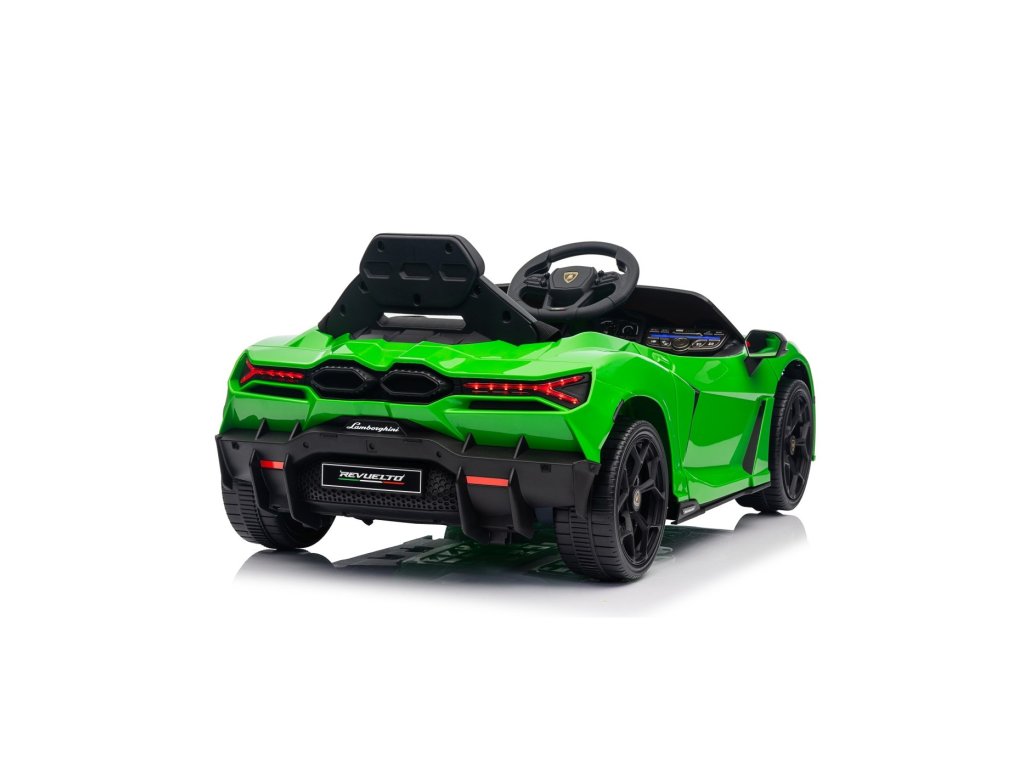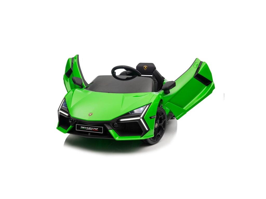 Детска акумулаторна кола Lamborghini Revuelto зелена е миниатюрна версия на фантастичния автомобил, с оригинална лицензия от автомобилната компания. Интериорът на колата е вдъхновен от оригиналния модел в пълен размер. Това е съчетание на спортен стил, минимализъм и функционалност.