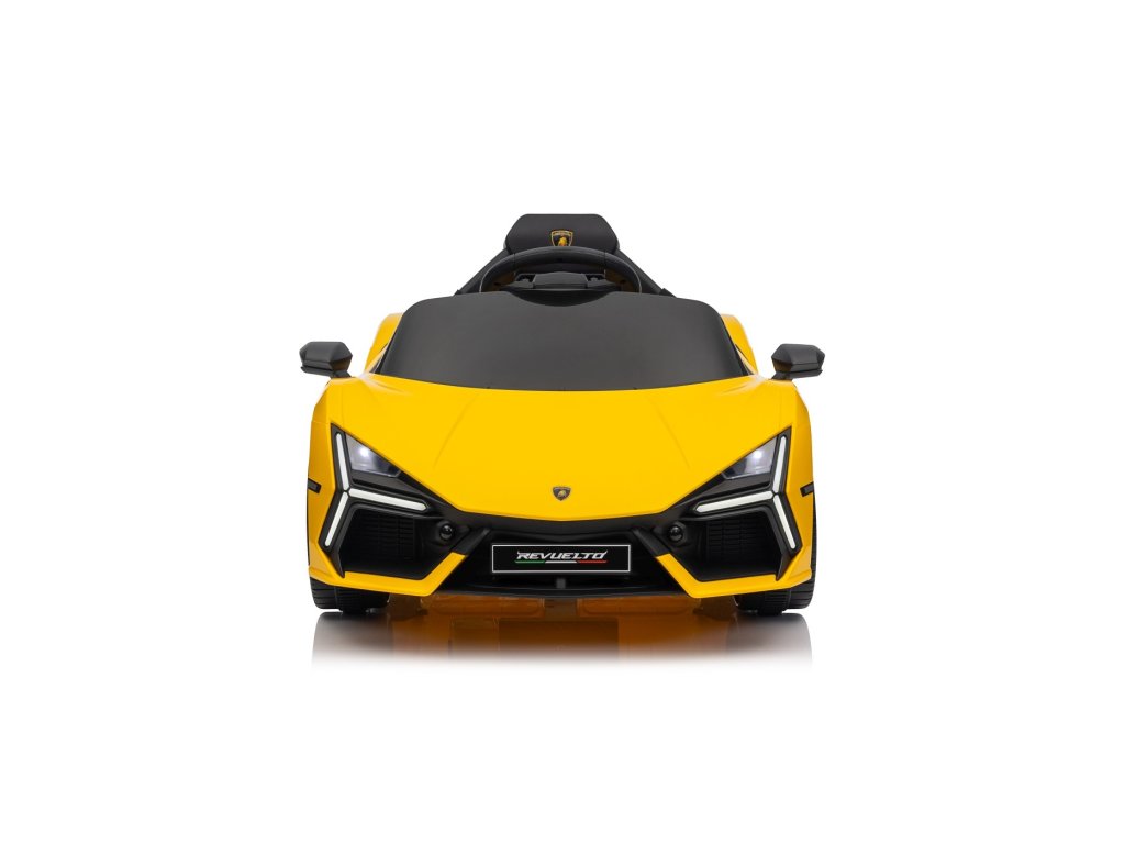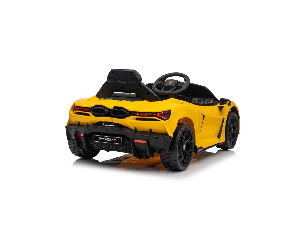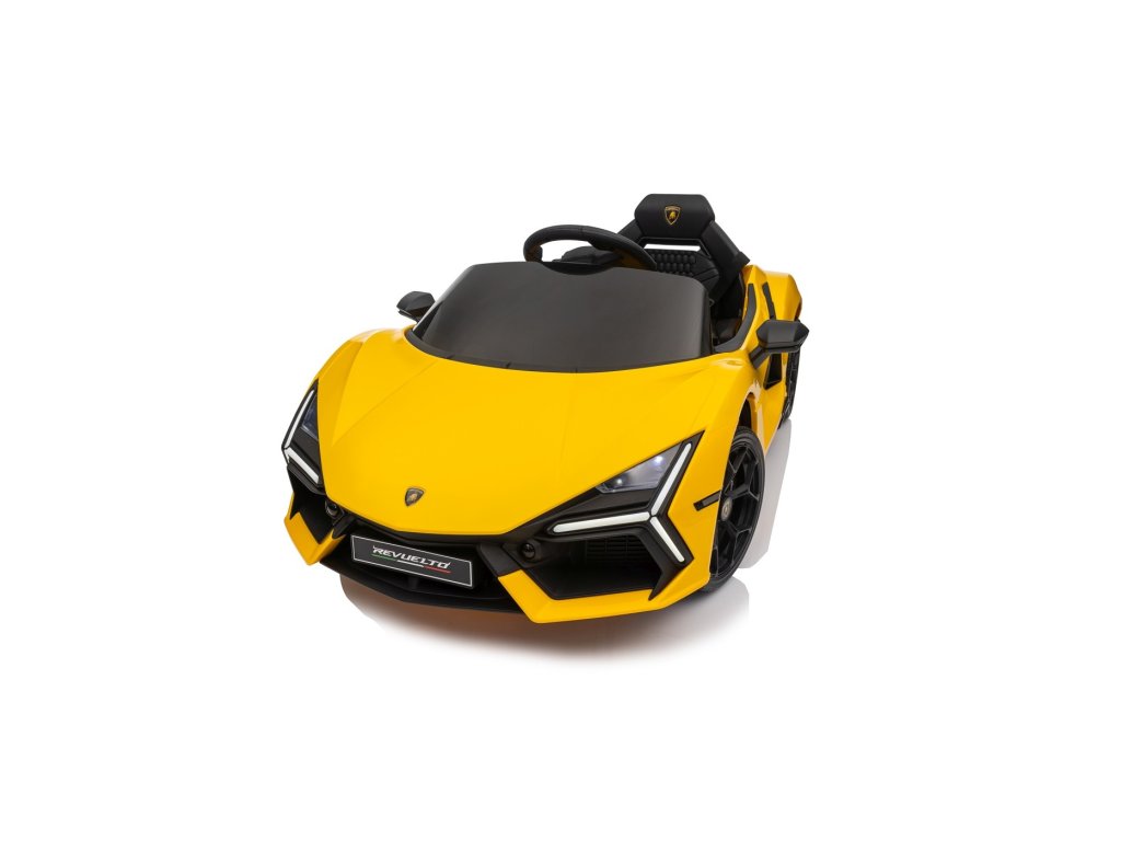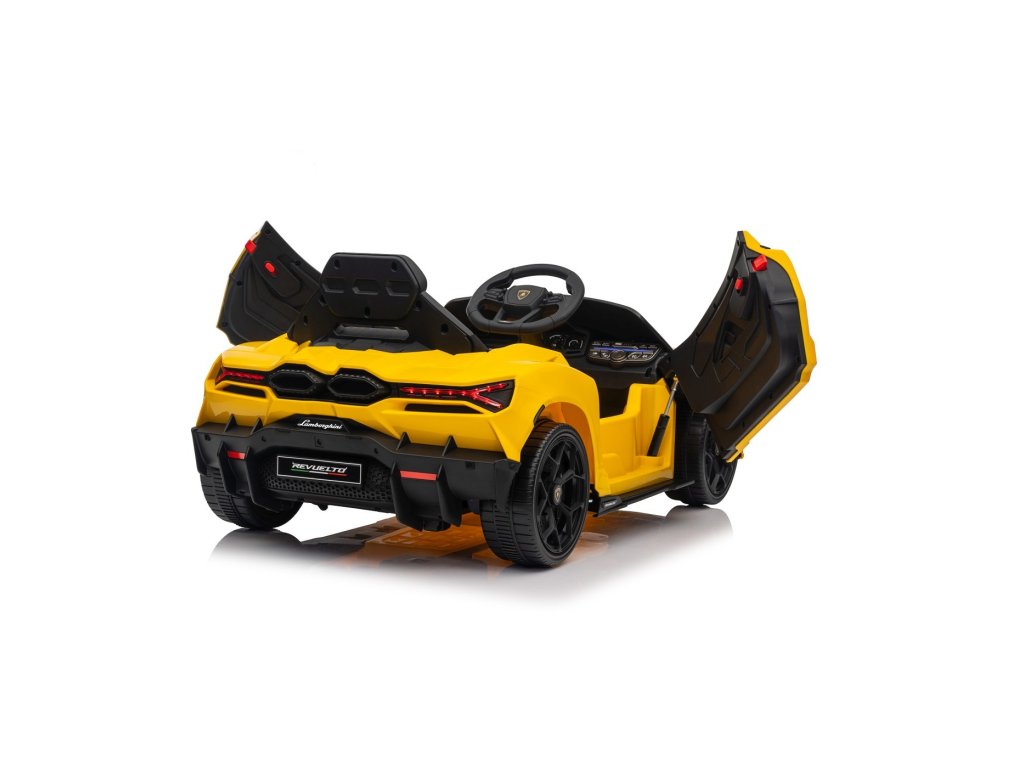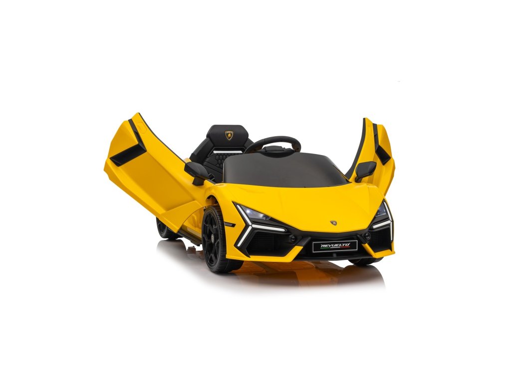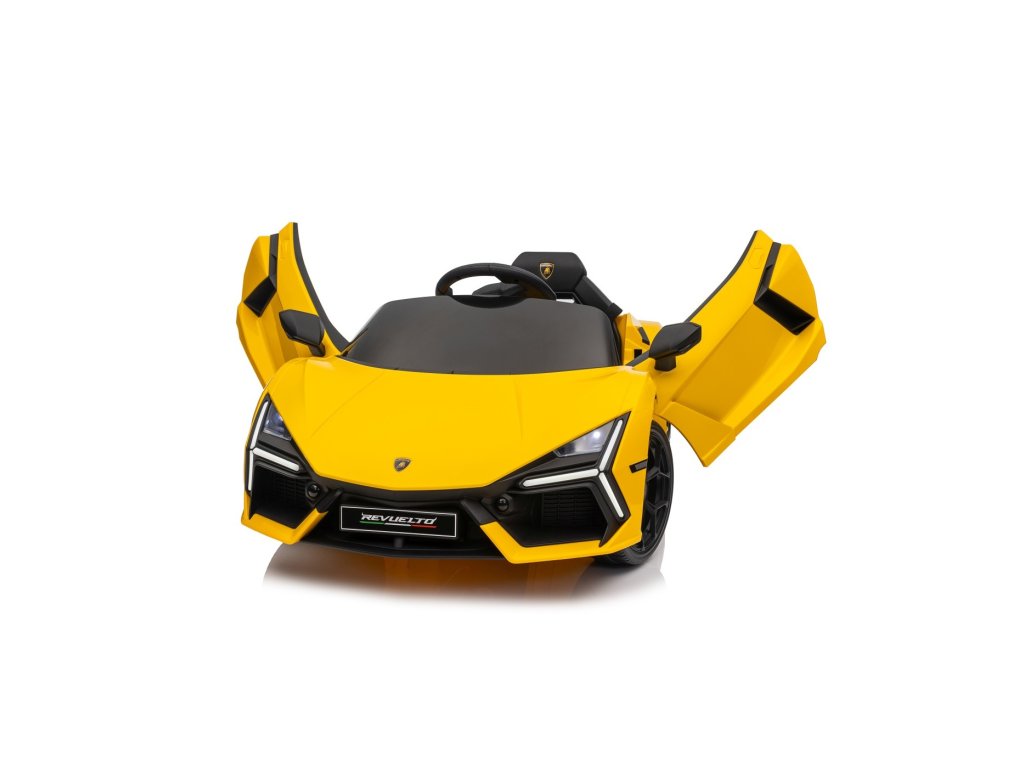 Детска акумулаторна кола Lamborghini Revuelto жълта е миниатюрна версия на фантастичен автомобил с официална лицензия от автомобилната компания. Интериорът на колата също е вдъхновен от истинския модел с пълен размер. Това е съчетание от спортен стил, минимализъм и функционалност.