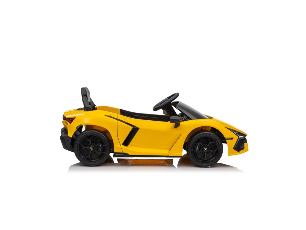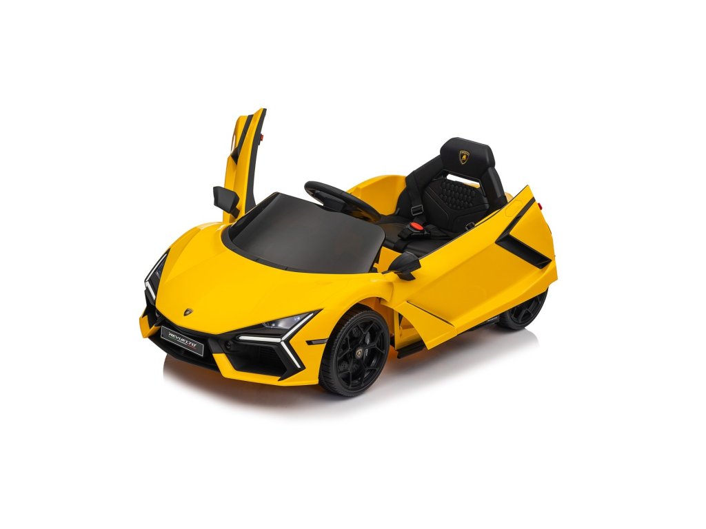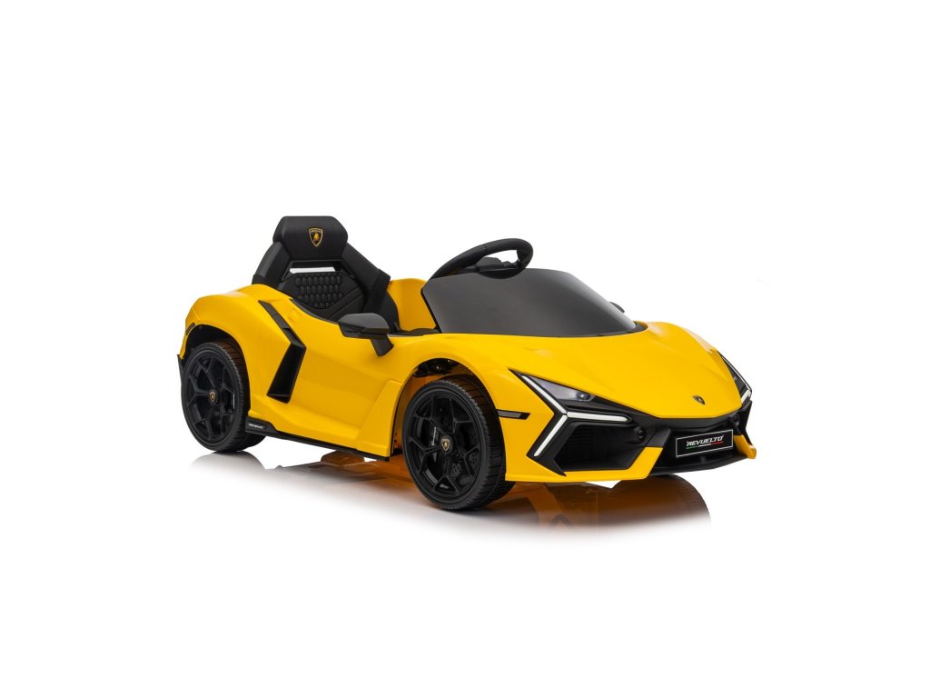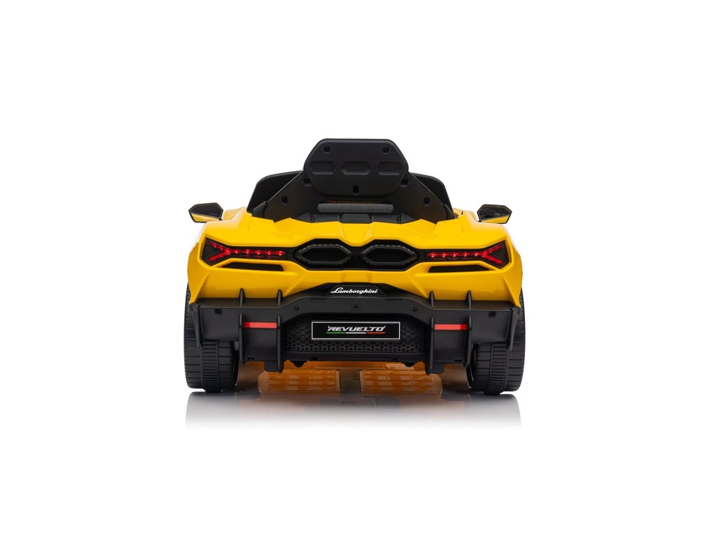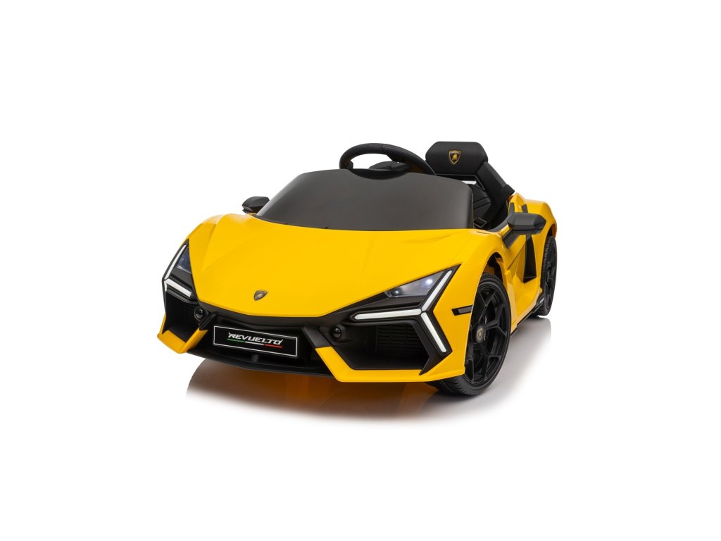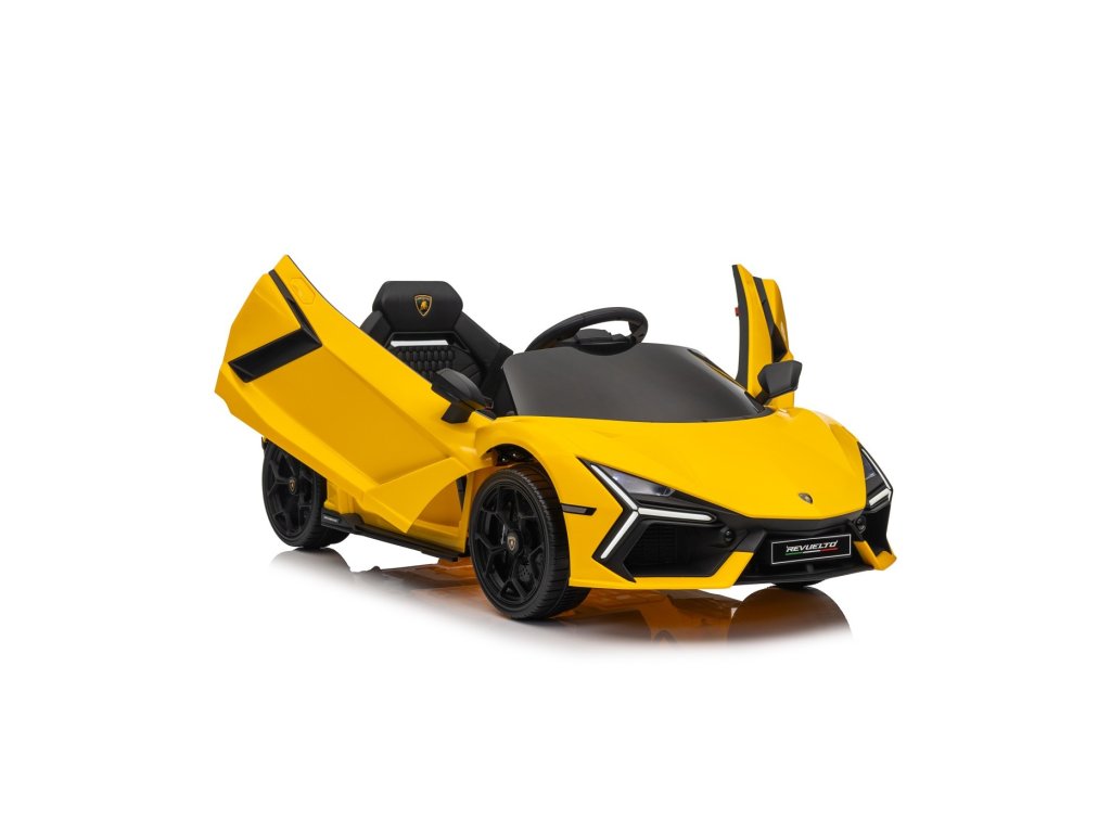 Детска акумулаторна кола Lamborghini Revuelto жълта е миниатюрна версия на фантастичен автомобил с официална лицензия от автомобилната компания. Интериорът на колата също е вдъхновен от истинския модел с пълен размер. Това е съчетание от спортен стил, минимализъм и функционалност.
