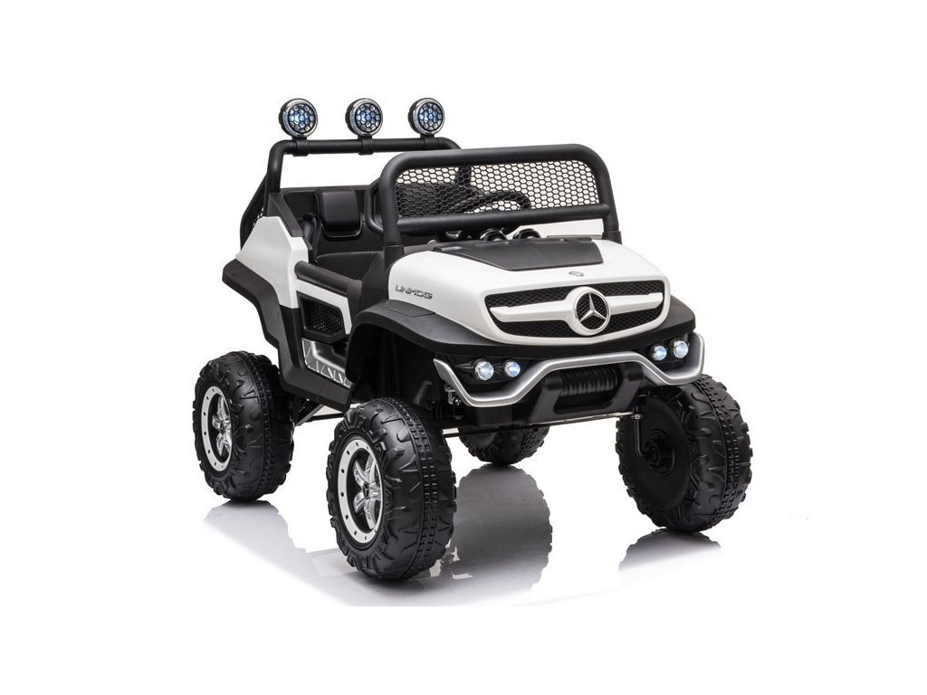 Детска акумулаторна кола Mercedes-Benz Unimog S 4x4 бяла е създадена да се справя с почти всякакъв терен. Разполага с четири мощни електрически мотора и меки пяни EVA гуми, които са тихи и надеждни.