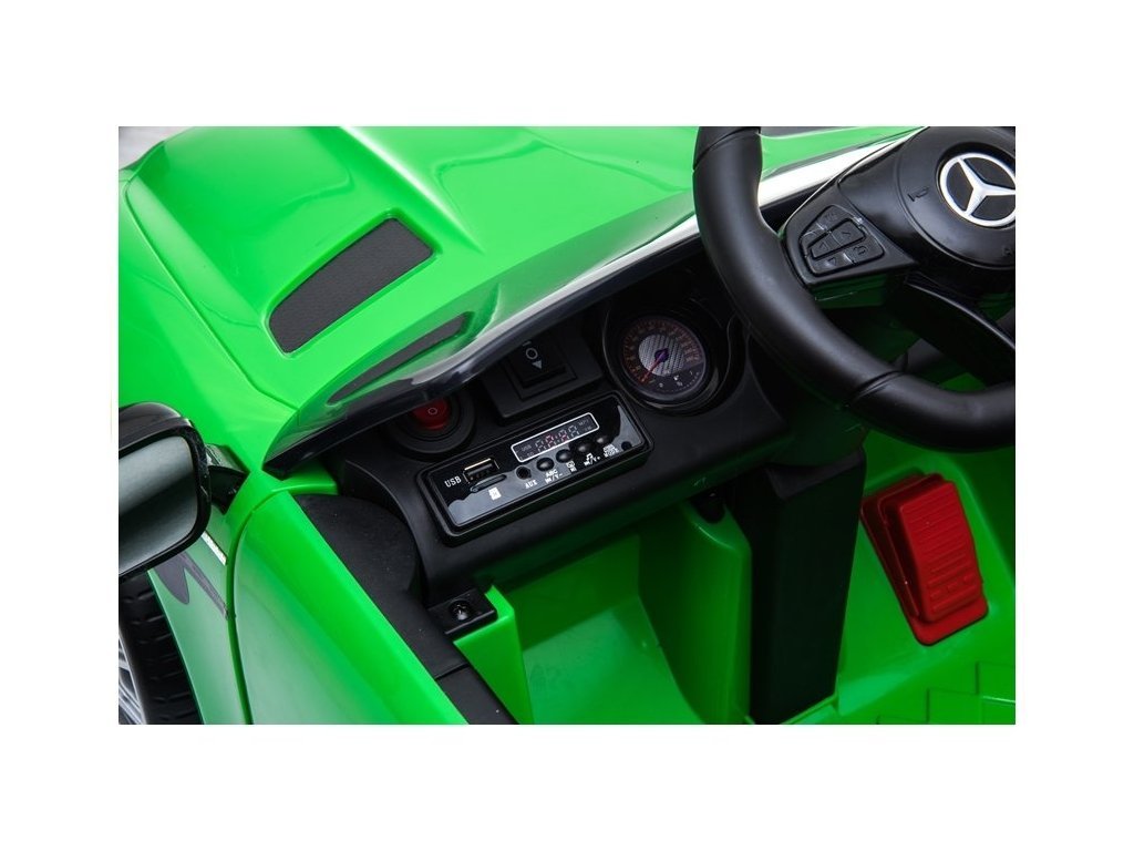 Задължителен елемент в този електрически автомобил с батерия е музикалният плейър. FM радио може да се свърже към USB порт, както и към SD карта за памет, което позволява пътуване с любимата музика на фона. Над него има и ключ за включване и изключване на фаровете, за да се чувства детето сякаш кара истински автомобил. Единственото ограничение пред играта с този зелен Mercedes GTR е теглото – максималното натоварване на акумулаторната кола е 30 кг.