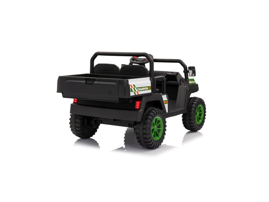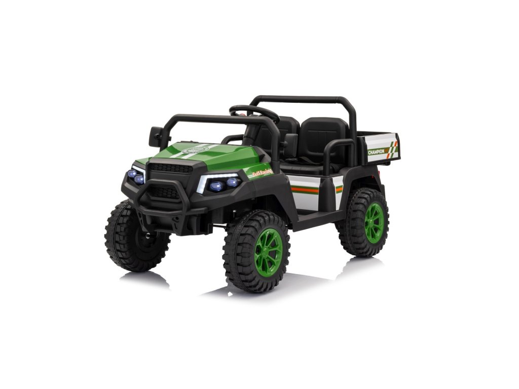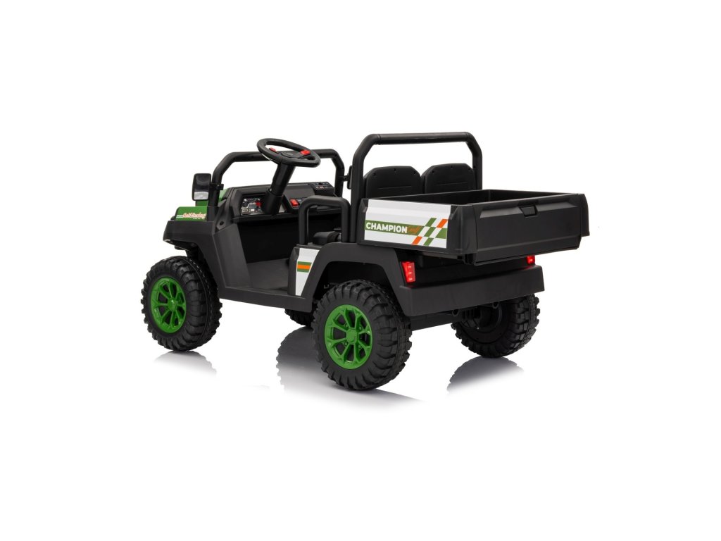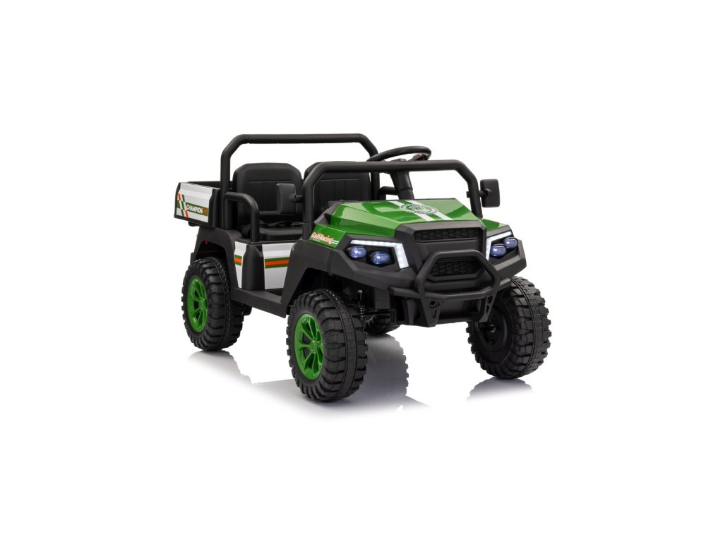 Детска акумулаторна кола Pick-Up Champion 24V зелена е мощен и стилен автомобил за двама малки шофьори. Благодарение на две двигателя с мощност 200W (2 x 200W) и здрав акумулатор 24V 9Ah, този пикап е готов да преодолява асфалт, трева и лек терен. Меки EVA гуми и окачване отпред и отзад осигуряват плавно каране без вибрации.