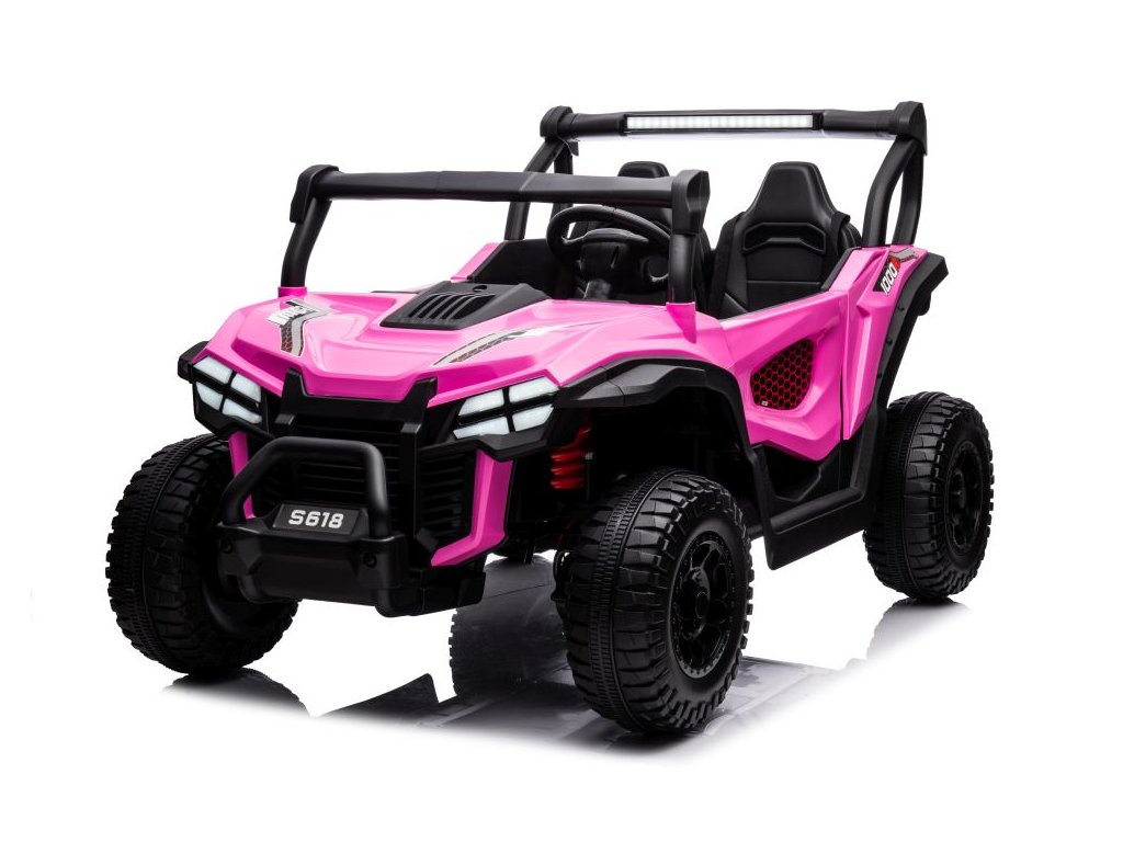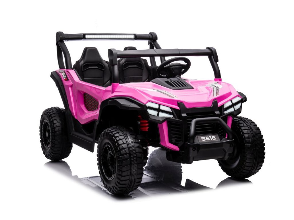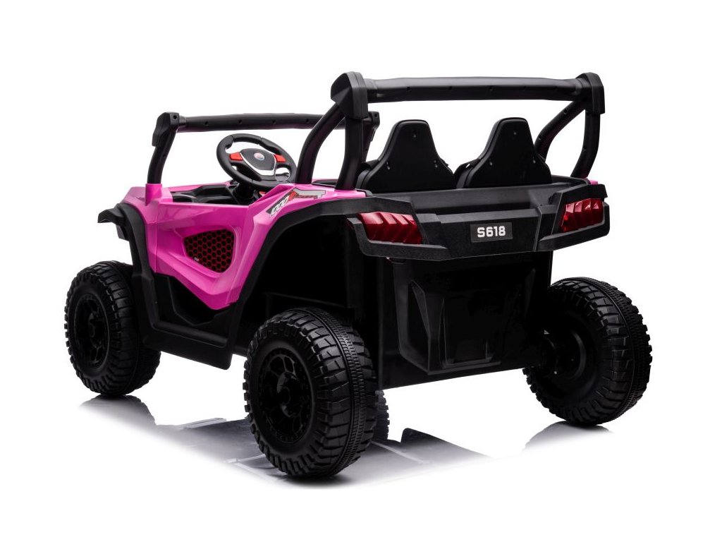 Детска акумулаторна колаДетска акумулаторна кола S618 4x4 24V розово е оборудвана с четири мотора с мощност 45W, което осигурява задвижване на всички колела – 4x4. За комфортно управление и плавност при возене допринасят гумите със специална пяна от EVA материал. За допълнително забавление на детето има музикален панел с входове за USB, Bluetooth и радио. Максималното натоварване на колата е 59 кг. Автомобилът разполага с предно LED осветление и врати, които се отварят.