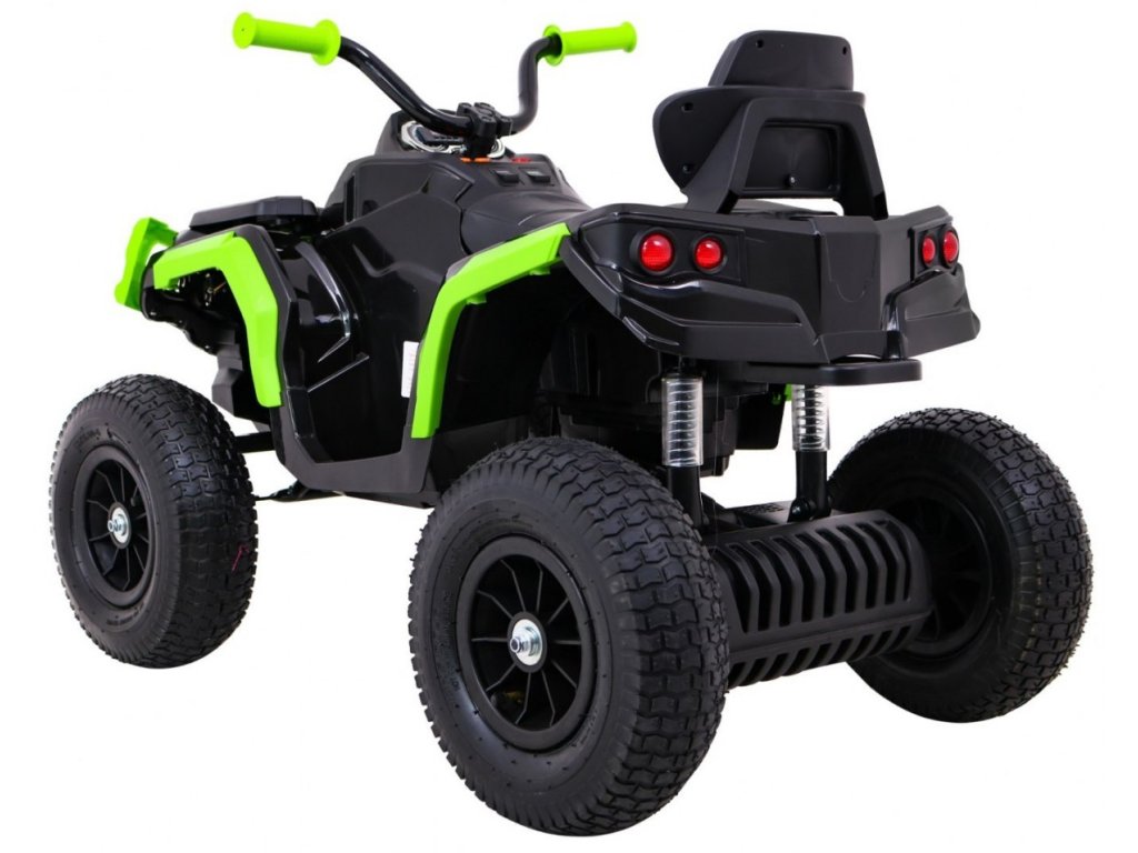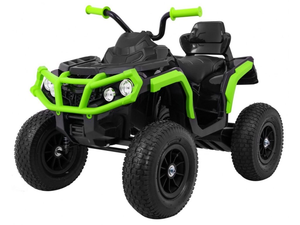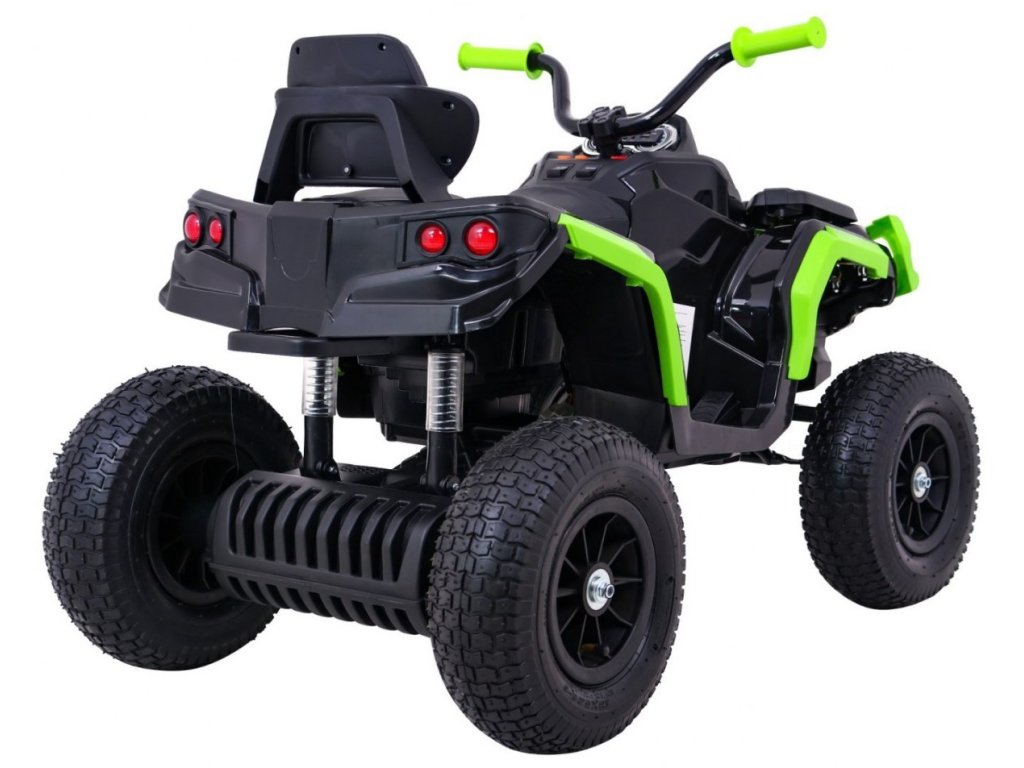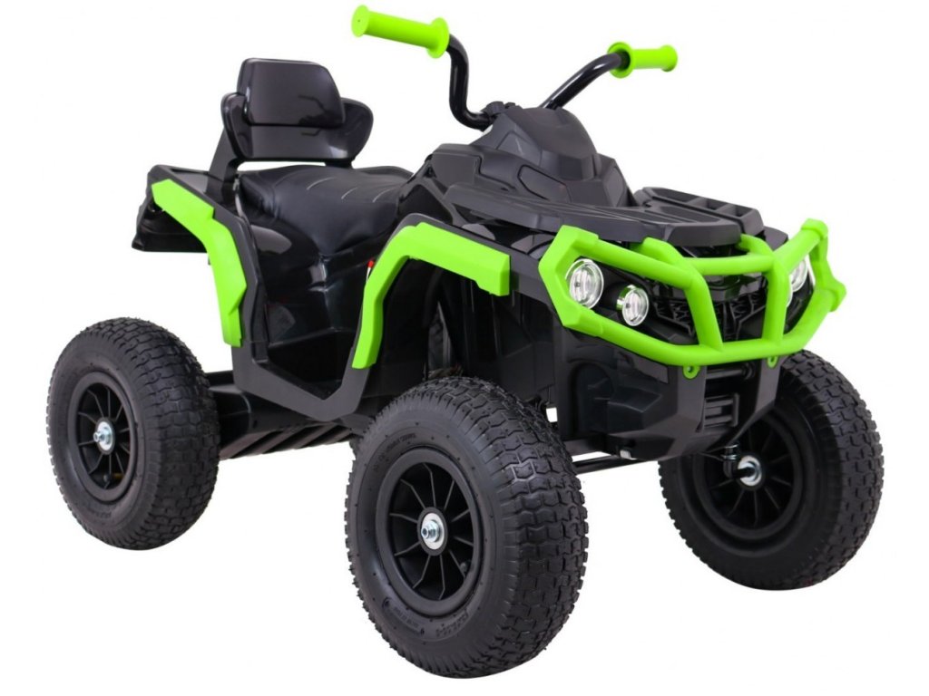 Детска акумулаторно атв с надуваеми колела черно-зелена разполага с мощен електрически мотор. Подходящ е за всички деца с тегло до 30 кг. Гумени надуваеми колела се адаптират към различни типове терени и се справят дори с неравни повърхности. Детето сяда на удобно оформено седалка от еко кожа и осветява пътя си с предни и задни LED светлини.
