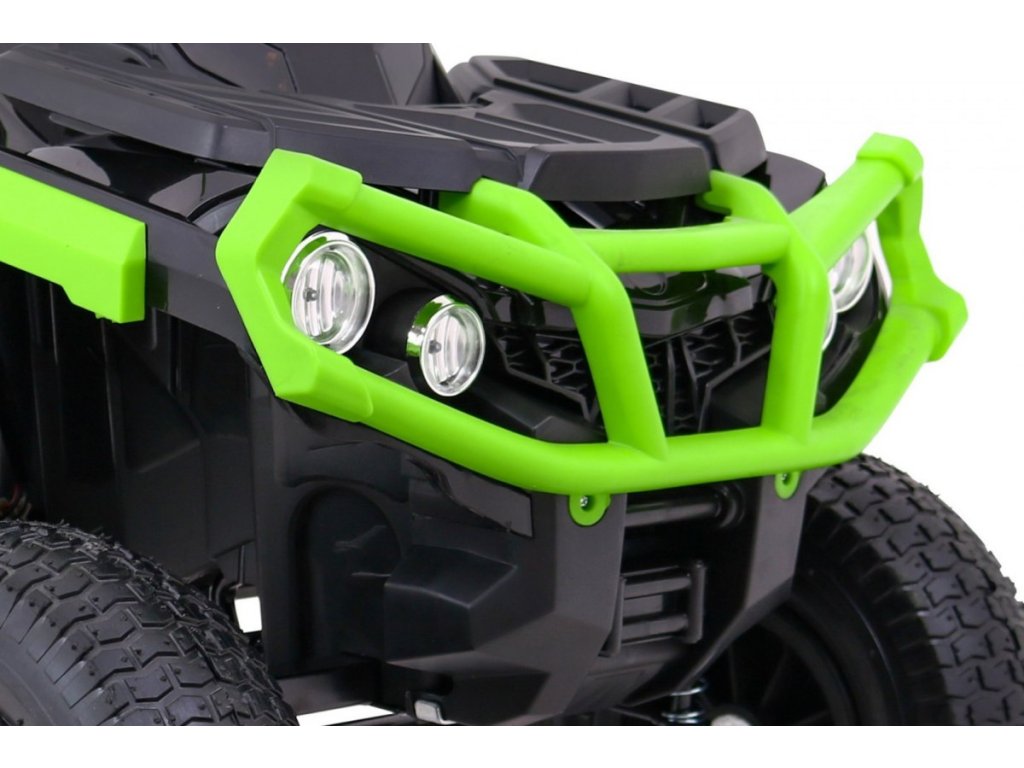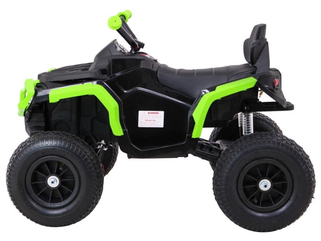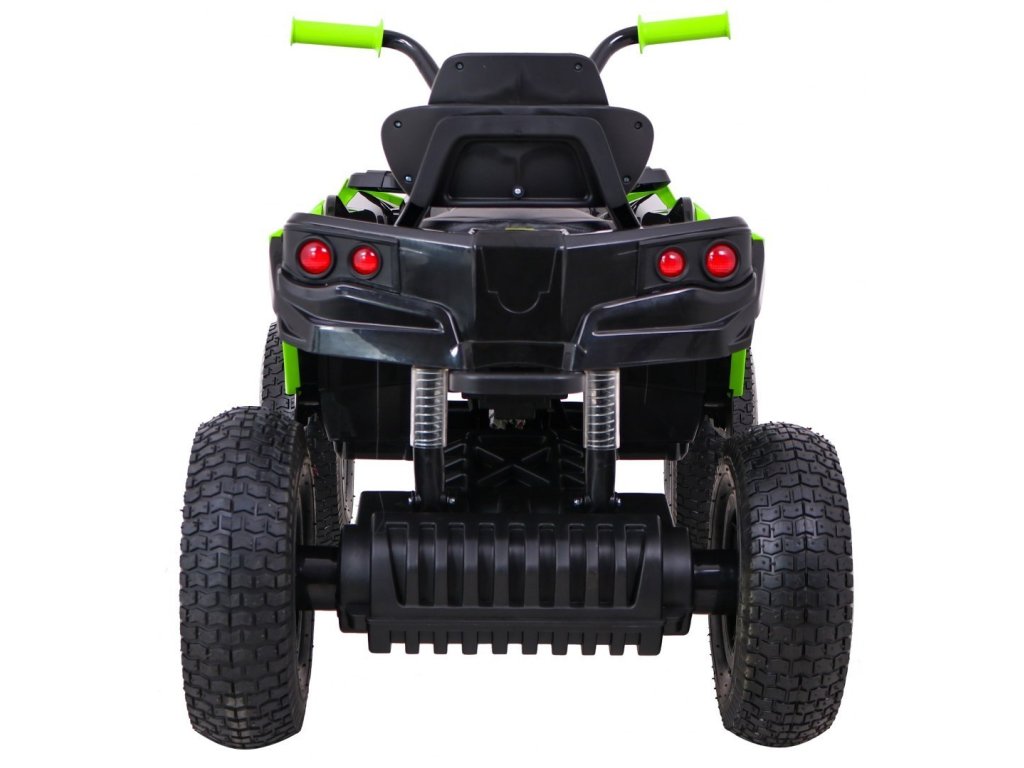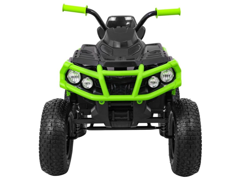 Детска акумулаторно атв с надуваеми колела черно-зелена разполага с мощен електрически мотор. Подходящ е за всички деца с тегло до 30 кг. Гумени надуваеми колела се адаптират към различни типове терени и се справят дори с неравни повърхности. Детето сяда на удобно оформено седалка от еко кожа и осветява пътя си с предни и задни LED светлини.