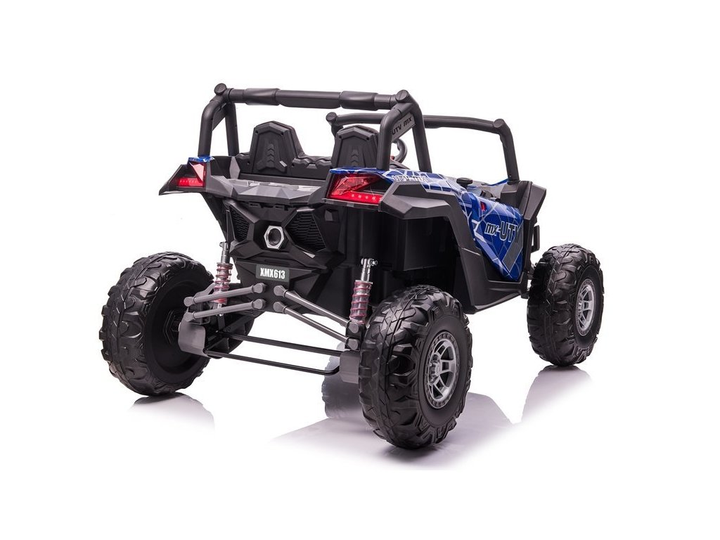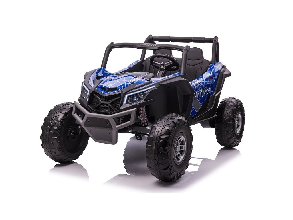 Детска акумулаторно бъги UTV-MX 4x4 LCD MP4 Spider боядисано синьо разполага с четири мощни електрически мотора с мощност 60W всеки и широки Eva колела, благодарение на които без проблем преодолява различни видове терен. Максималното натоварване на бъгито е до 50 кг, което позволява на две деца да седнат удобно в него.