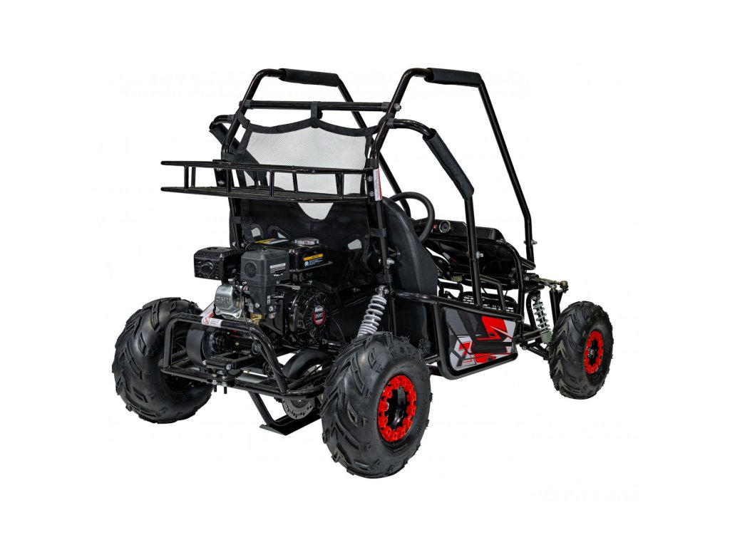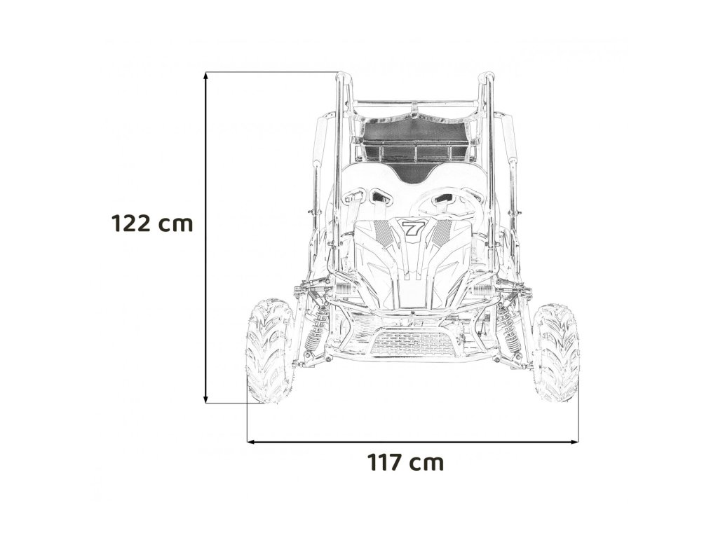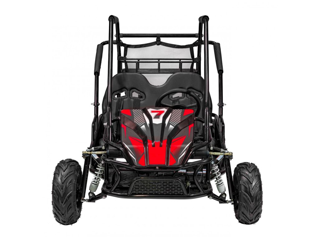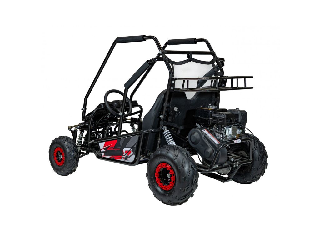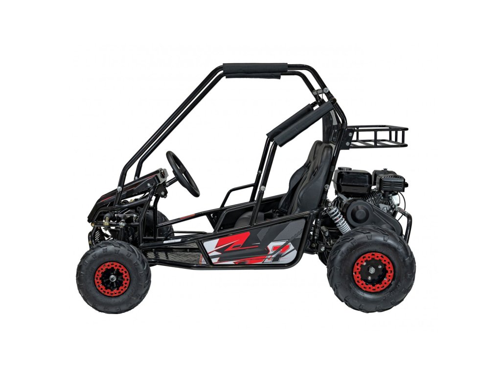 Детска бензинова бъги кола LUCKY SEVEN червена е оборудвана с едноцилиндров четиритактов двигател и широки надуваеми гуми. Превозното средство разполага с резервоар с вместимост 3,6 литра.
