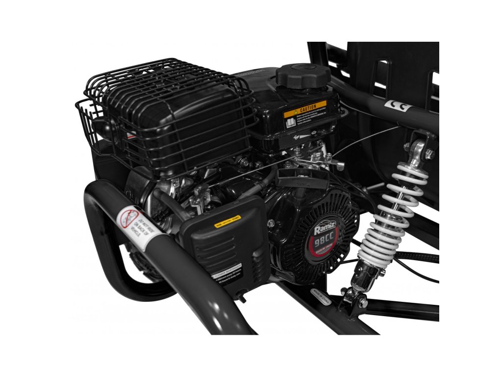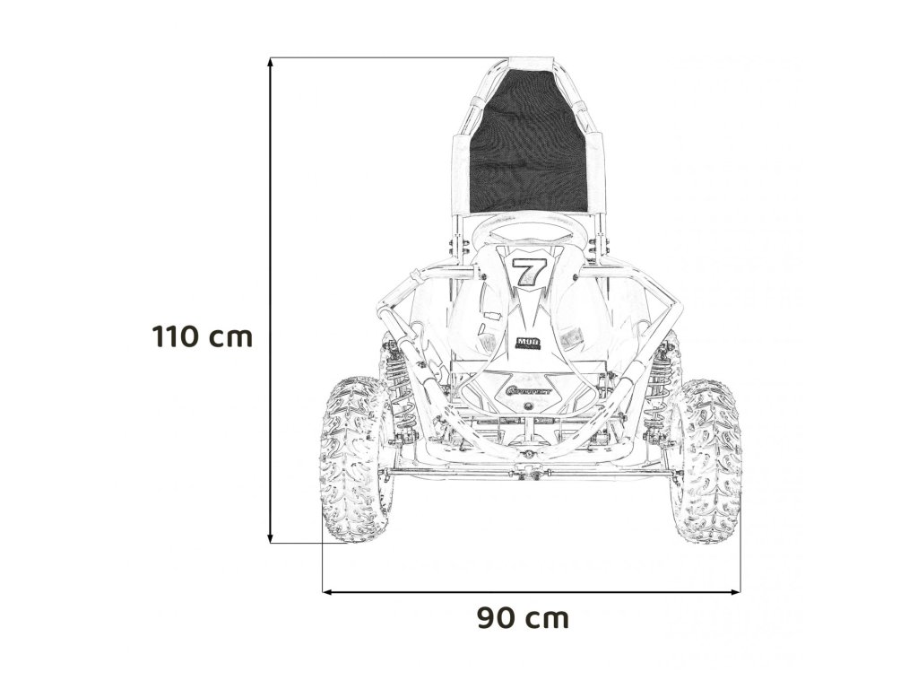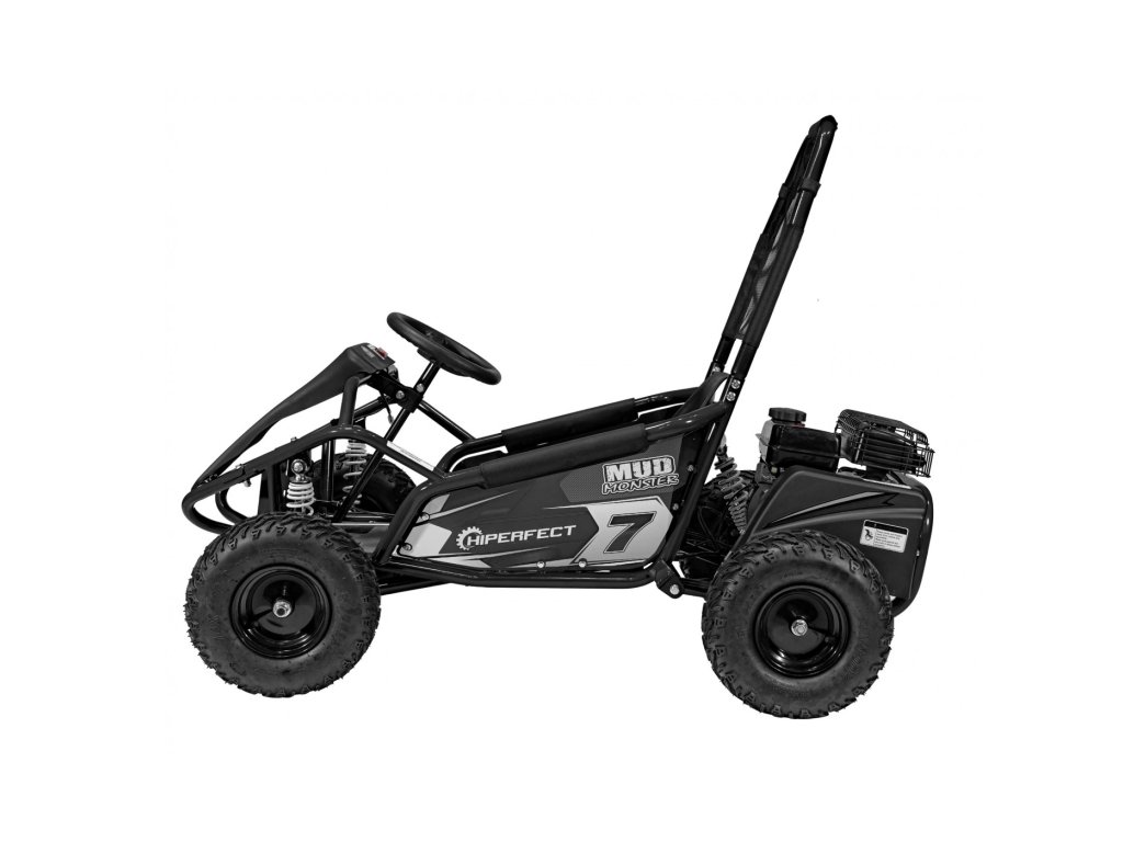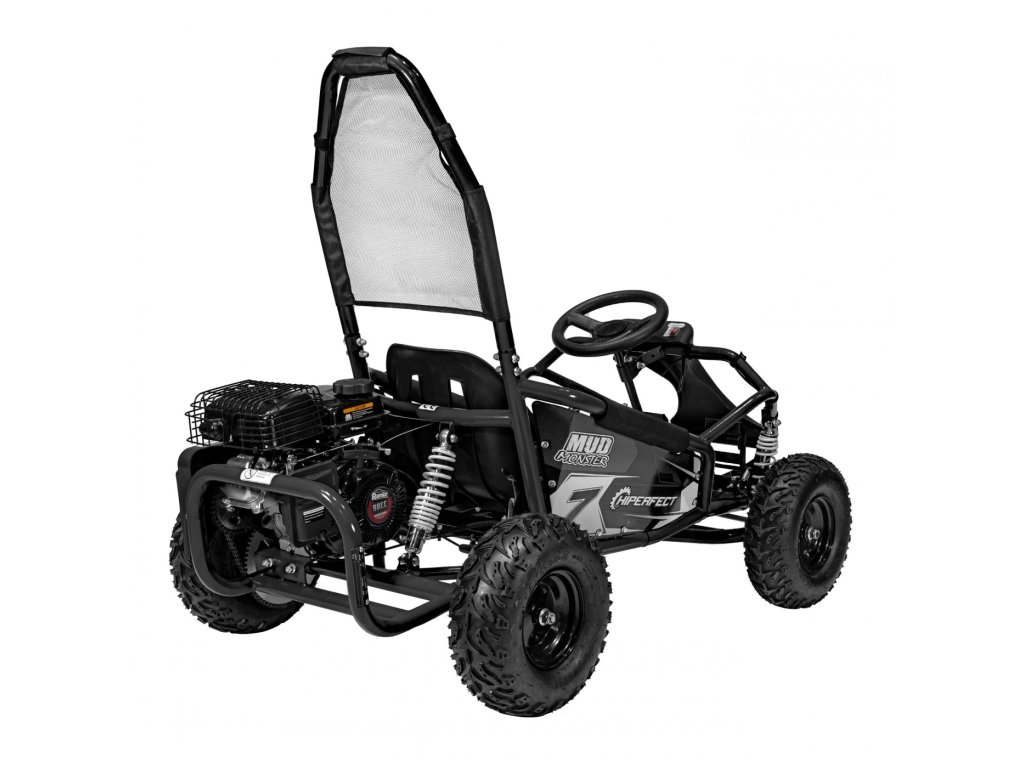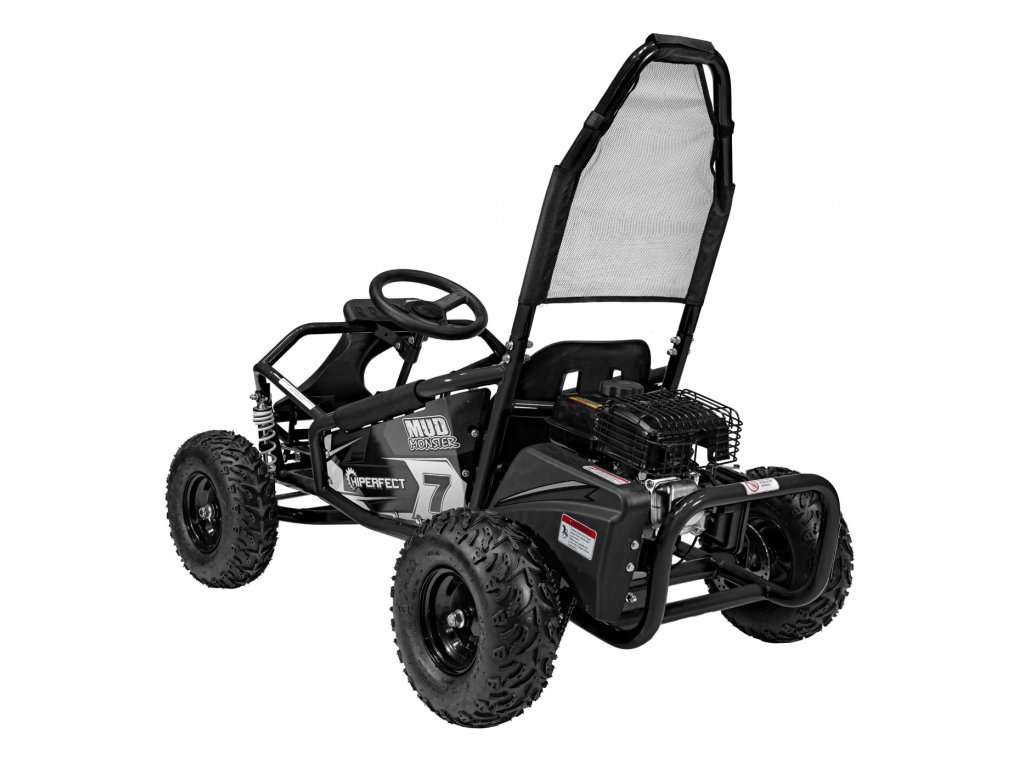 Детска бензинова мотокара MUD MONSTER черна е оборудвана с едноцилиндров четиритактов двигател и широки пневматични гуми. Превозното средство разполага с резервоар с вместимост 2,3 литра.