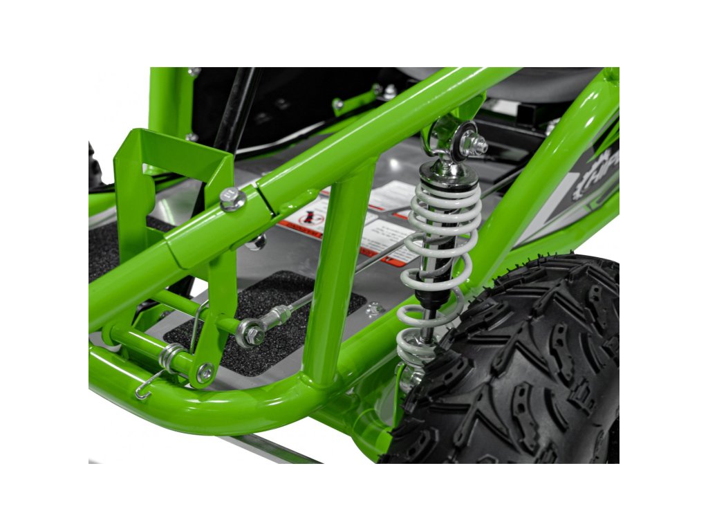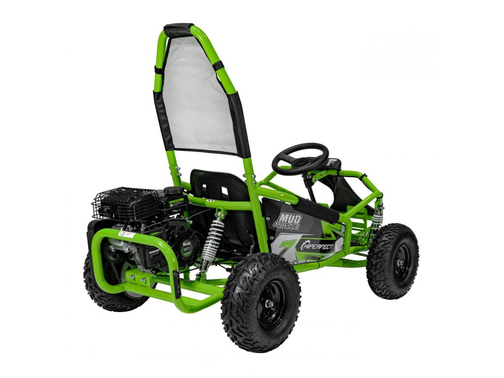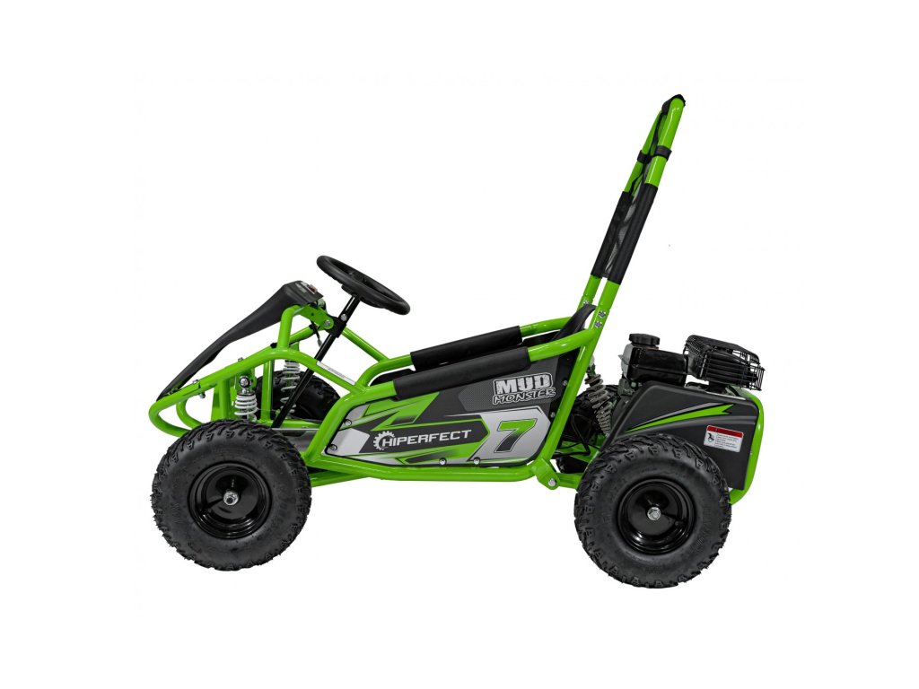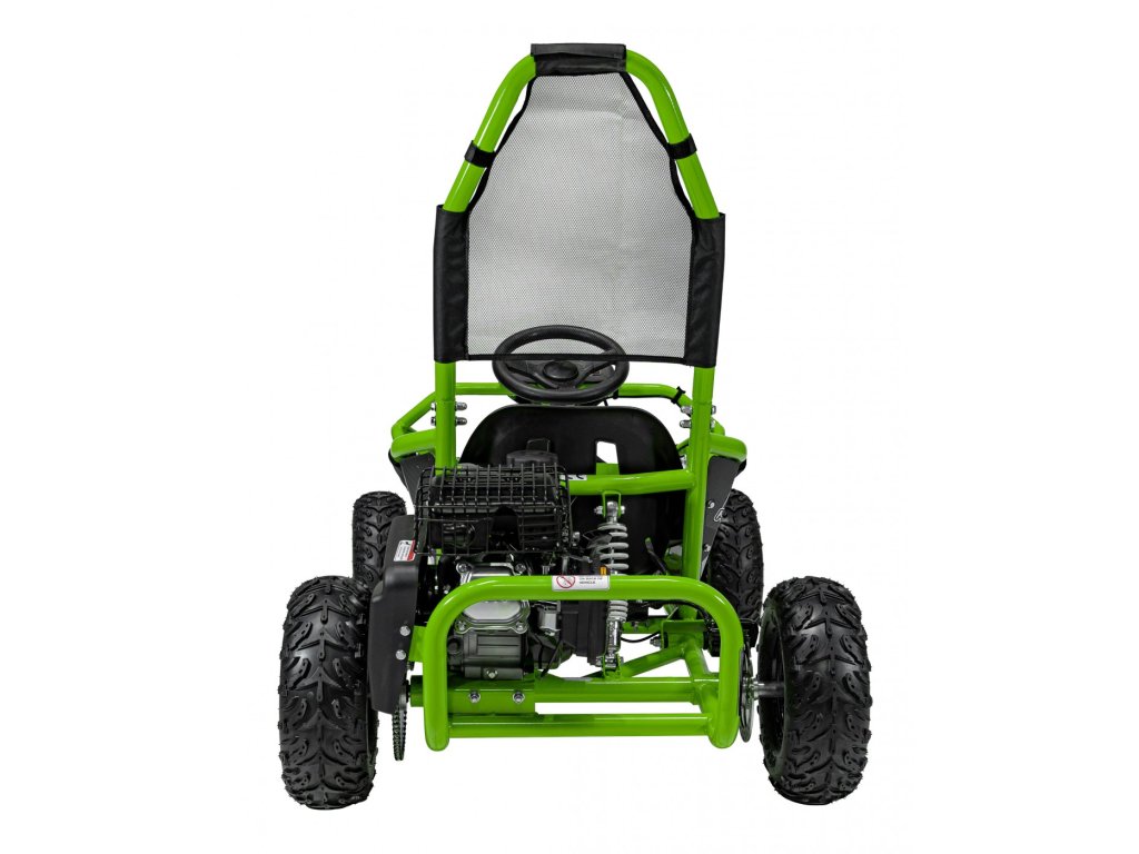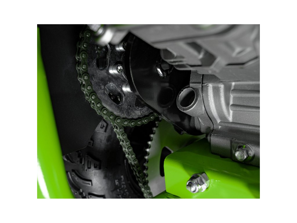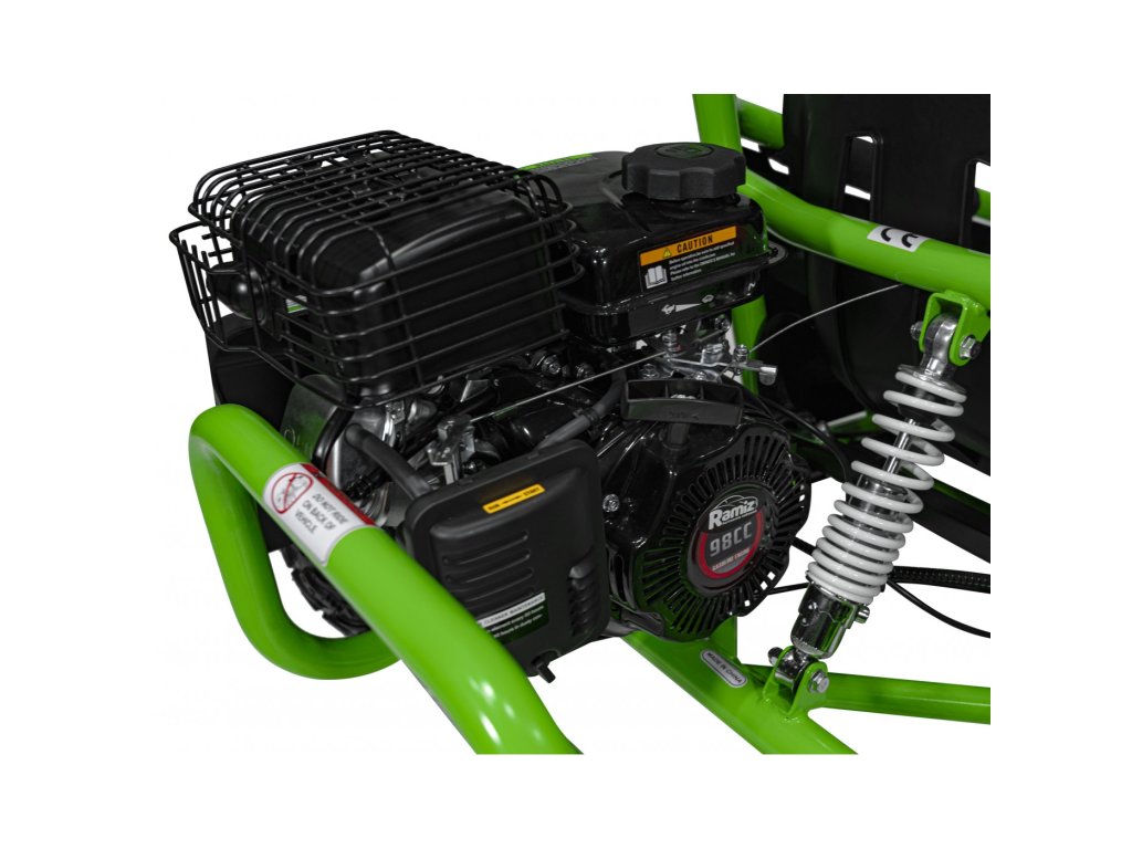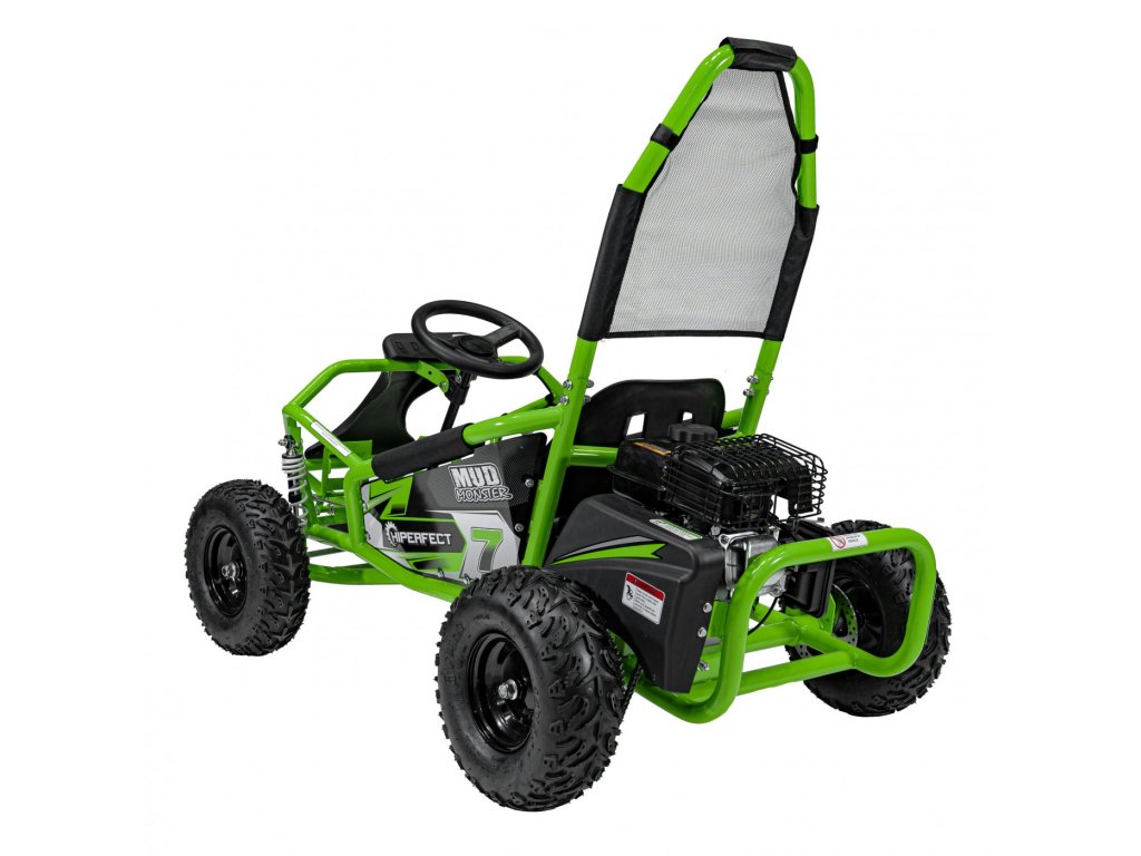 Детска бензинова мотокари MUD MONSTER зелена е оборудвана с едноцилиндров четиритактов двигател и широки пневматични гуми. Превозното средство разполага с резервоар с вместимост от 2,3 литра.