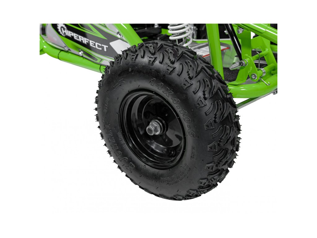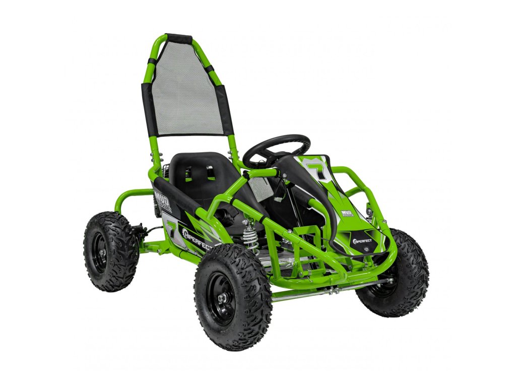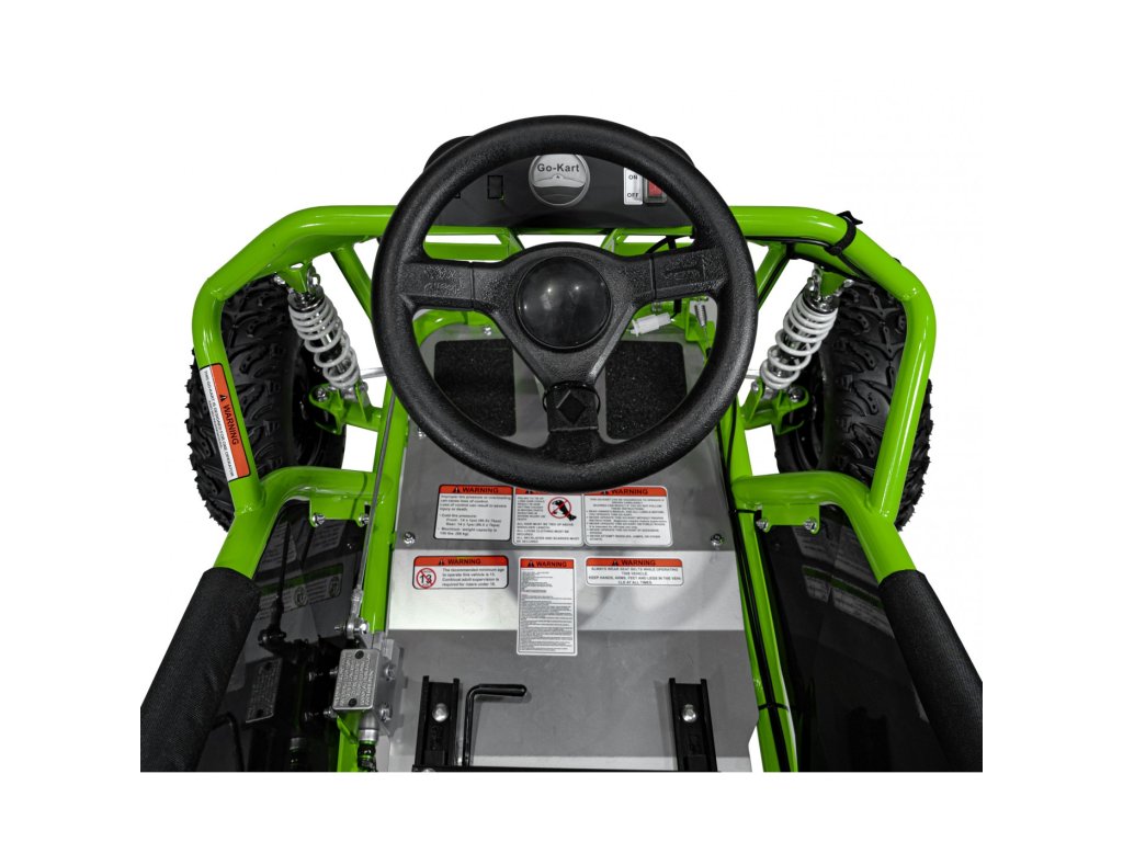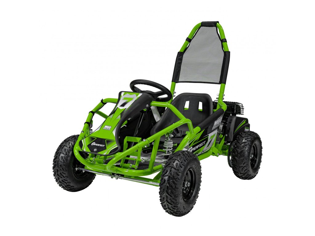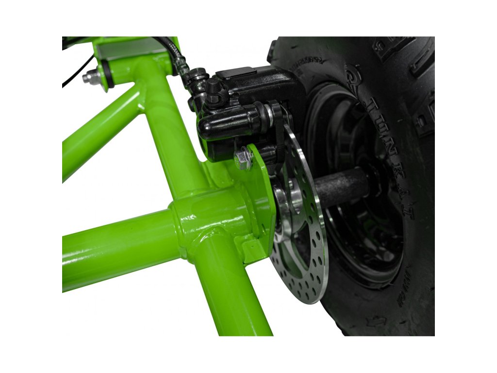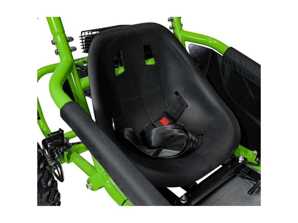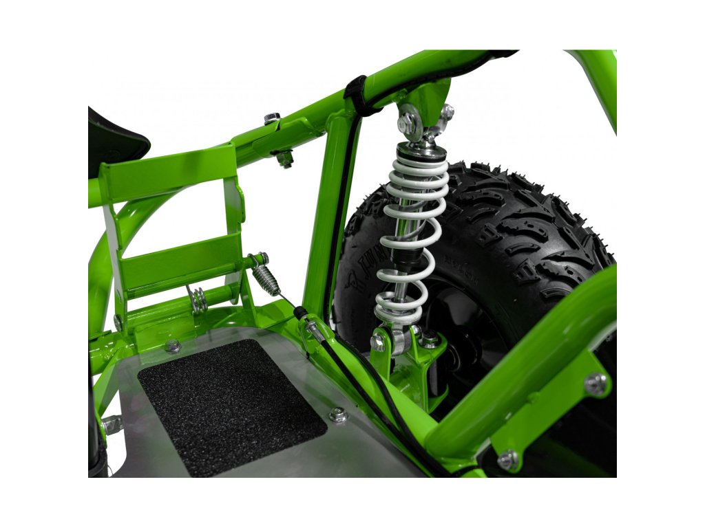 Детска бензинова мотокари MUD MONSTER зелена е оборудвана с едноцилиндров четиритактов двигател и широки пневматични гуми. Превозното средство разполага с резервоар с вместимост от 2,3 литра.