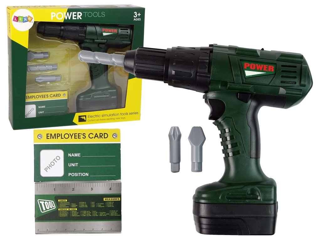Детска бормашина зелена се активира чрез натискане на бутона. Всичко това е придружено от реалистичен звук, който прави играта още по-забавна. Възможността за безкрайно завинтване и развинтване с взаимнозаменяеми бормашинни накрайници прави играта още по-приятна.