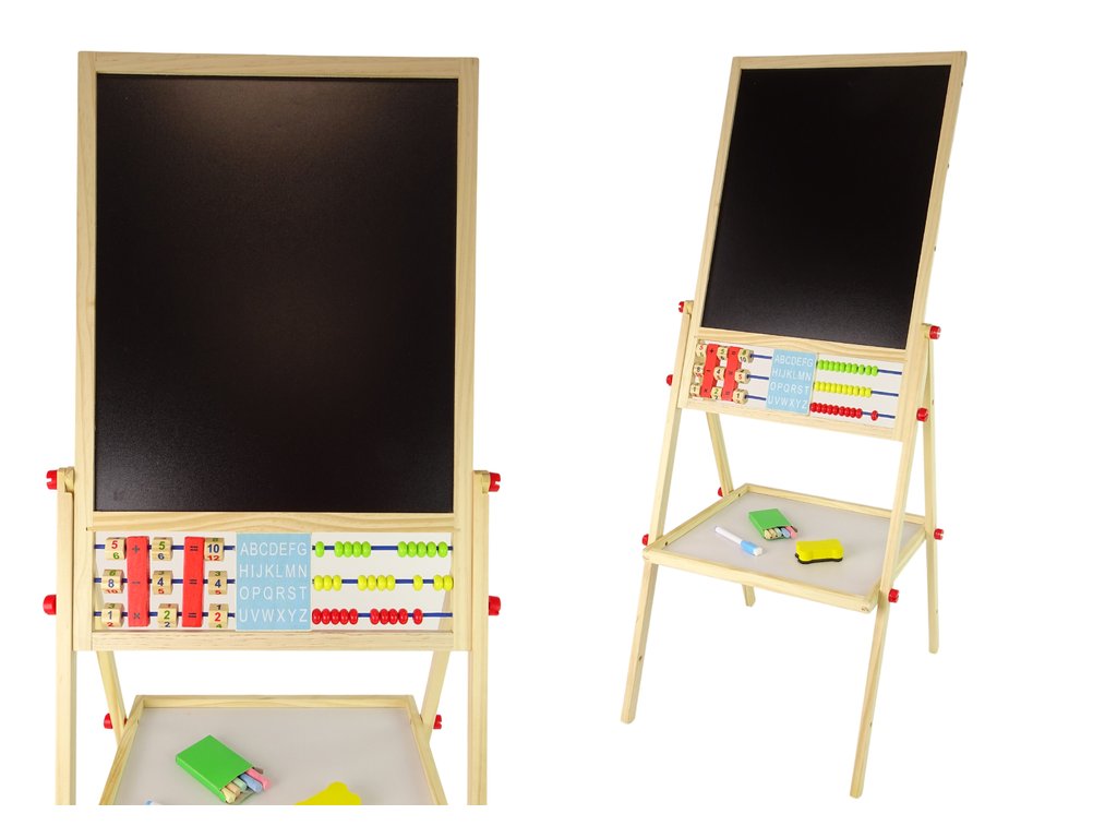 Тази двустранна детска дъска от дърво е идеална за деца от 3 години нагоре. Широко разположените крака осигуряват стабилност и безопасност по време на игра. Под дъската има поставка за тебешир и гъба. Едната страна представлява класическа черна дъска за писане и рисуване с тебешир в няколко цвята. Повърхността лесно се почиства с включената в комплекта гъба. От другата страна е магнитна бяла дъска.