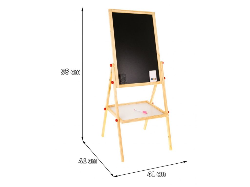 Детска двустранна дъска за рисуване разполага с магнитна повърхност от едната страна, на която може да се пише с маркер. Обратната страна е предназначена за писане с тебешир. Комплектът включва маркер с магнит, който може да бъде прикрепен към дъската, както и гъба за изтриване. Включени са 5 цветни тебешира.