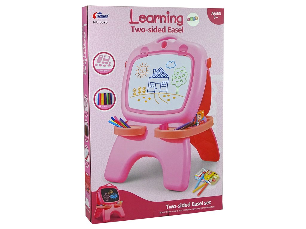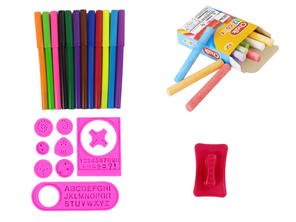 Двустранната магнитна дъска има две повърхности. Бяла страна, предназначена за използване с изтриваеми маркери, и черна страна за рисуване с тебешир. Комплектът включва 12 цветни маркера и 12 цветни тебешира. В долната част на дъската има малки отделения за всички принадлежности, докато не ги използвате или не са ви необходими в момента. Освен това, в горната част има кука, на която може да закачите лист хартия. Допълнителните шаблони с геометрични фигури и букви помагат на малчугана да учи цифри, букви и нови форми.