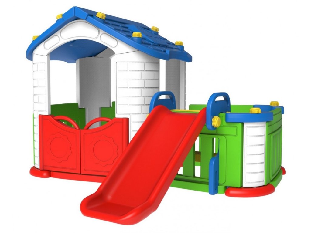 Приказна детска градинска къщичка със пързалка синя с просторно вътрешно пространство и пързалка. Къщичката разполага с отваряща се врата и здравa конструкция. Пързалката може да бъде монтирана от всяка страна на къщичката и предверието. Играчката е изработена от висококачествени материали, като всички стени и компоненти са направени от двойно пластмасово покритие. Детската градинска къщичка е устойчива на атмосферни влияния и UV защита. Подходяща за деца на възраст от 1 година. Продуктът е с европейски сертификат за безопасност CE. Произведено в Корея.