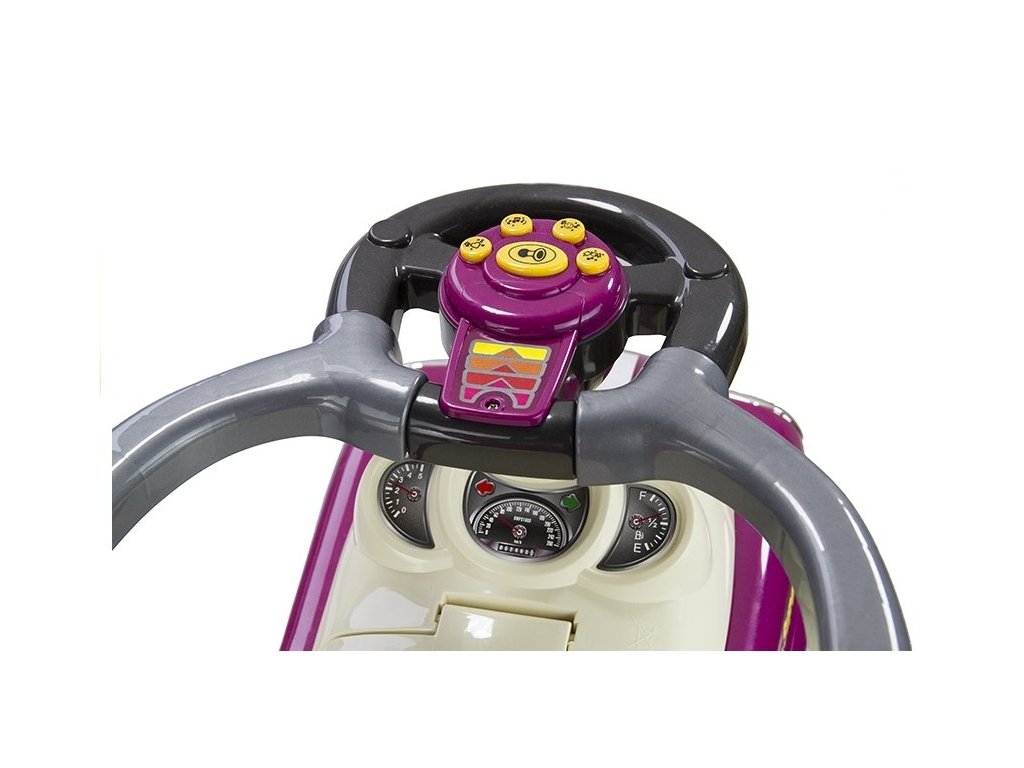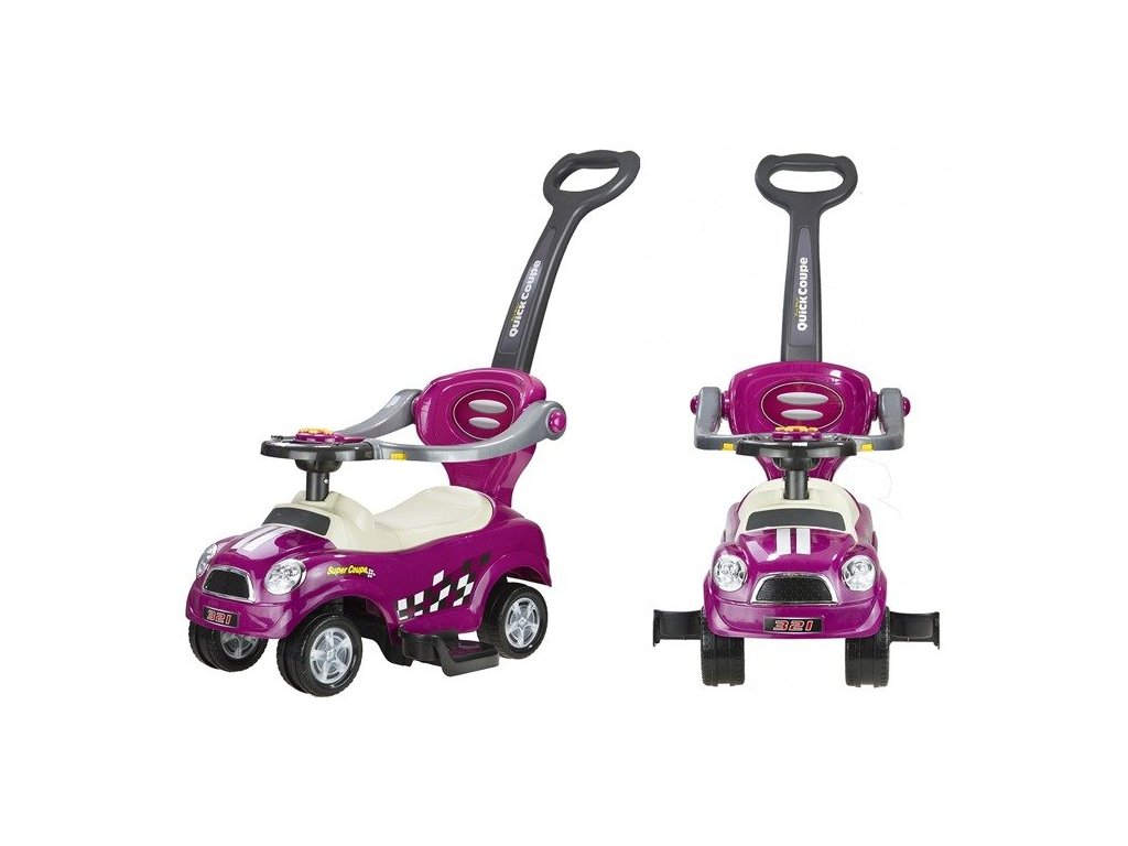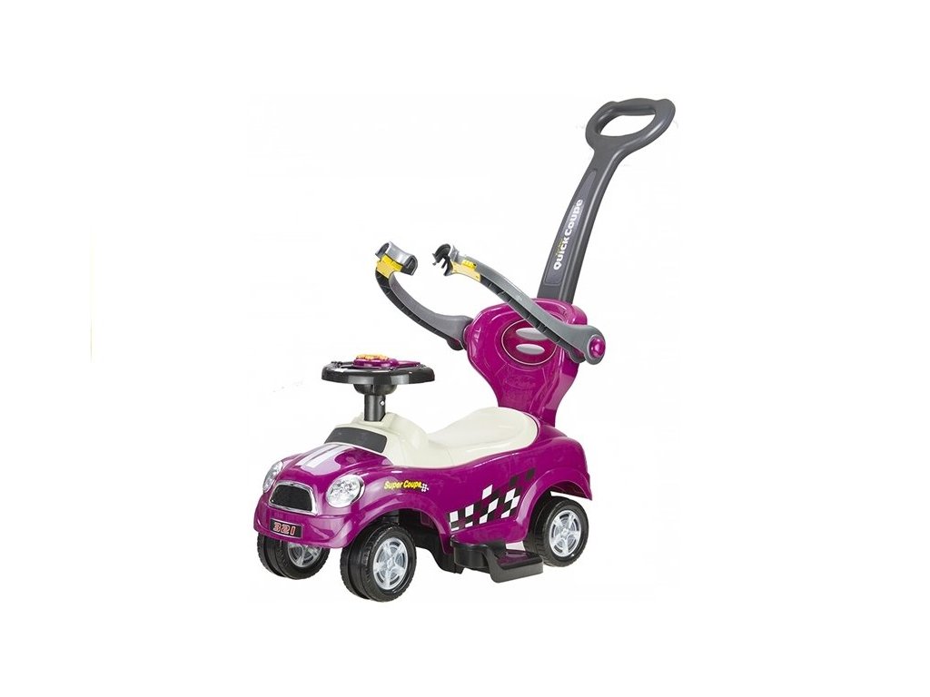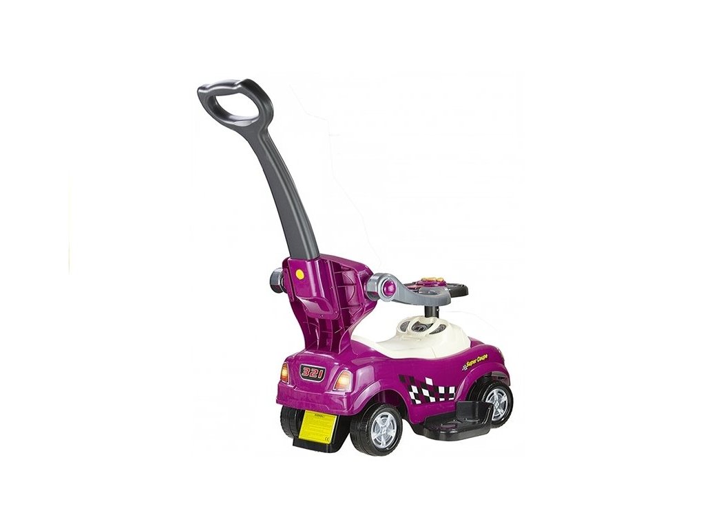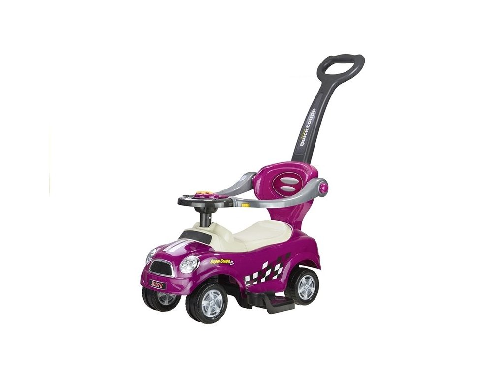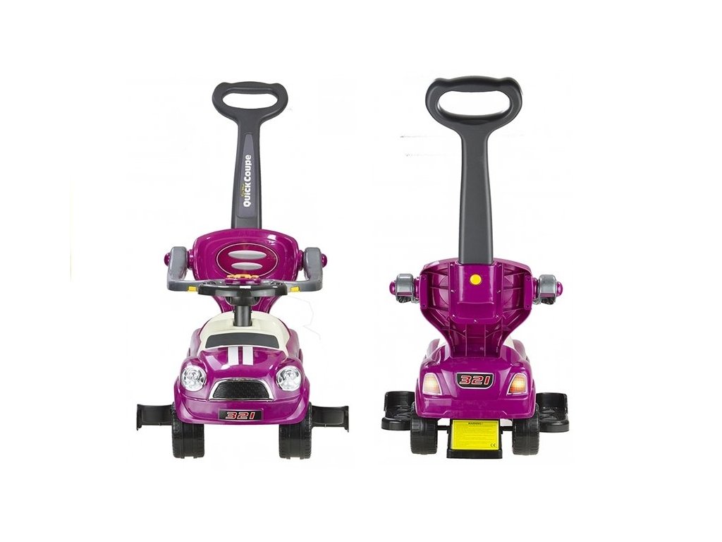 Детска играчка превозно средство купе лилаво 3 в 1, която може да се използва като проходилка, буталка и баланс колело. Баланс колелото е изработено от качествен пластмасов материал, което позволява на детето да се движи свободно и пъргаво с крачетата си по земята. Воланът отпред дава възможност на детето само да избере посоката на движение. Ако обаче не желаете детето ви да контролира своето малко превозно средство, можете да го управлявате сами чрез родителската дръжка.