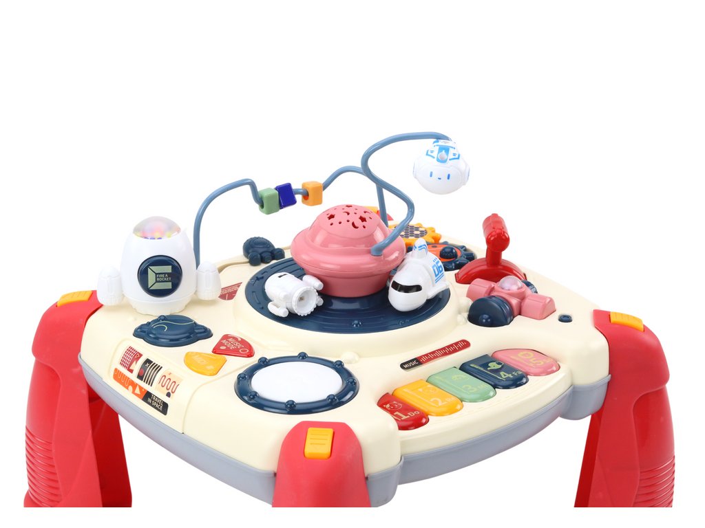 В центъра на масичката се намира очарователен въртележка с космически кораби и изглед към космоса. За да се задейства, е нужно само да се движи червената дръжка, която добавя елемент на интерактивност и насърчава децата да изследват.