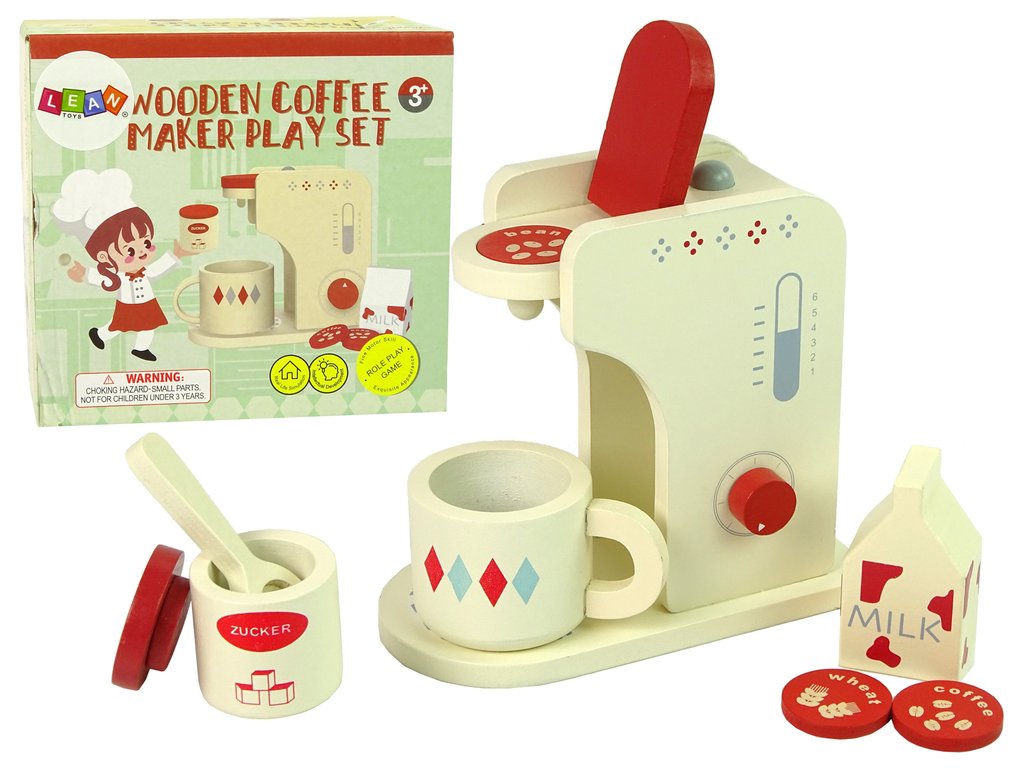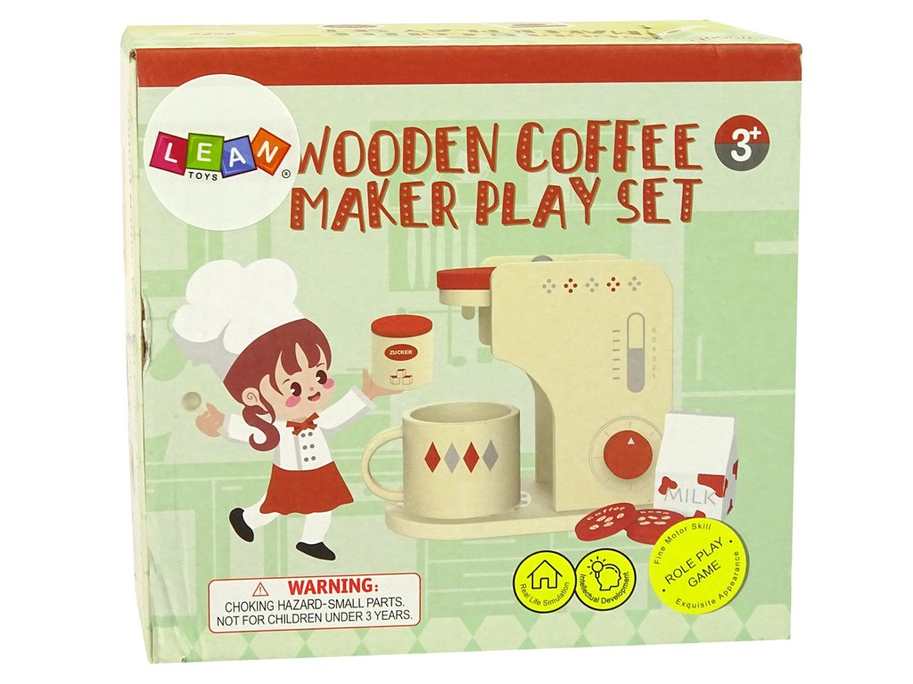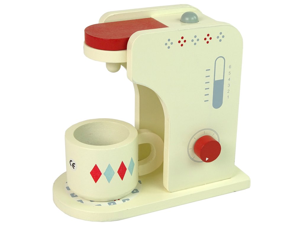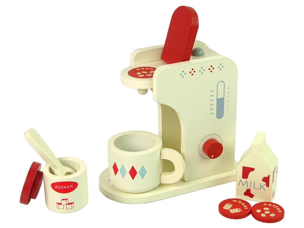 Детска кафе машина от дърво е незаменим аксесоар във всяка детска кухня. Машината разполага с подвижни елементи, които подпомагат развитието на сръчността и фината моторика. Комплектът включва чаша, захар, мляко и 3 вида малки капсули, които се поставят в кафемашината преди приготвянето на кафето. След това чрез бутоните детето избира своята любима напитка. Най-голямото предимство на играчката е, че е изработена от дърво, което повишава нейната безопасност и издържливост.