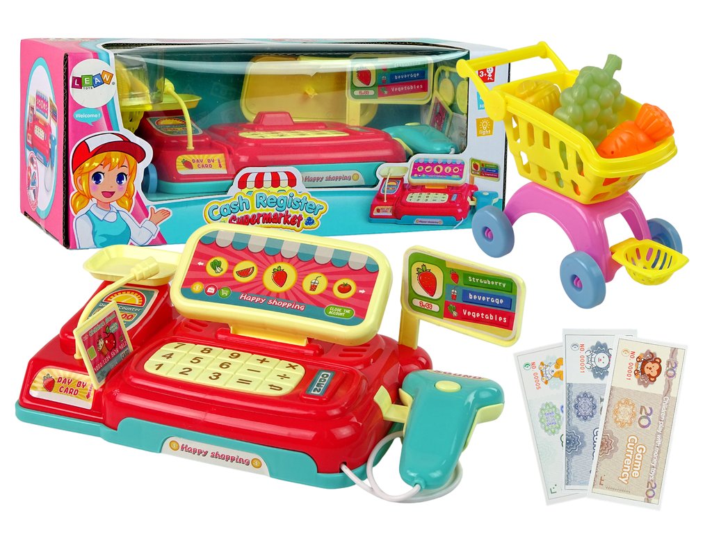 Детска каса с количка е изработена в червен цвят с жълти акценти. Фалшивите пари ви позволяват да плащате за хранителни стоки. Скенерът издава реалистичен звук, който се чува при пазаруване на пазара. Представената играчка е максимално безопасна, без остри ръбове и е произведена от висококачествени материали. Определено привлича вниманието на децата и ги насърчава към игра.